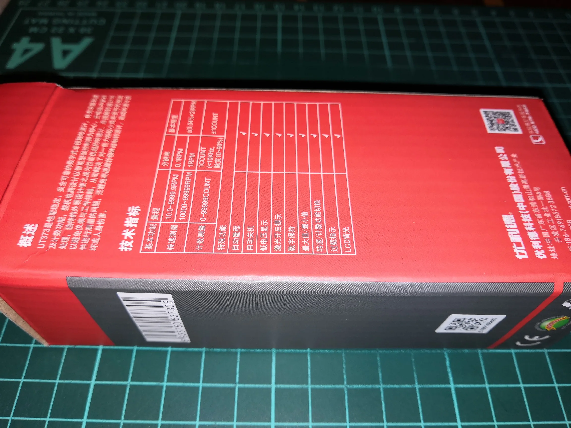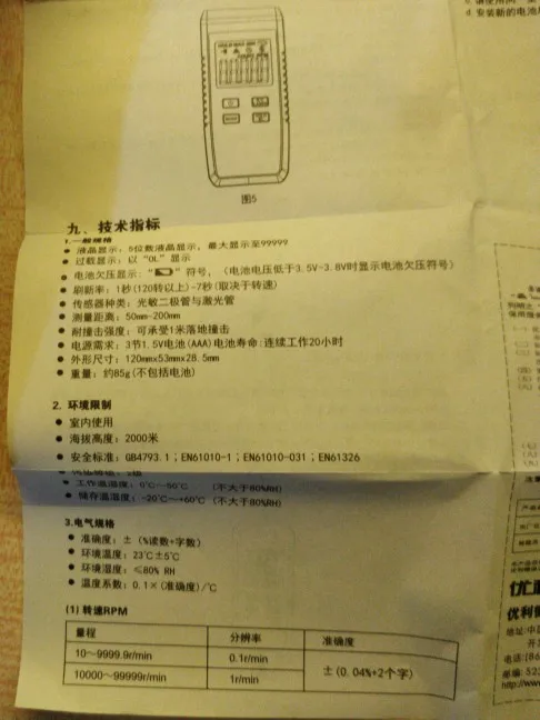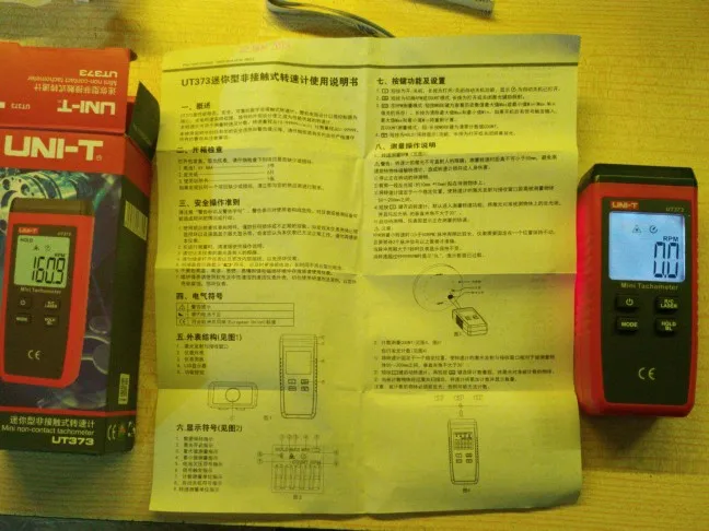Получил его, как указано без 3 батареек AAA. Было только китайское руководство, я связался с продавцом на английском языке, продавец дал мне ссылку на руководство на английском языке в формате pdf на следующий день. В ближайшее время был протестирован Тахометр на пиле и шлифовальной машине. Точные результаты вы получаете, когда вы приклеиваете светоотражающую ленту к лезвию и измеряете расстояние от 10 см. Если вы поместите его ближе, он измеряет отражение лезвия и измерения неточны.