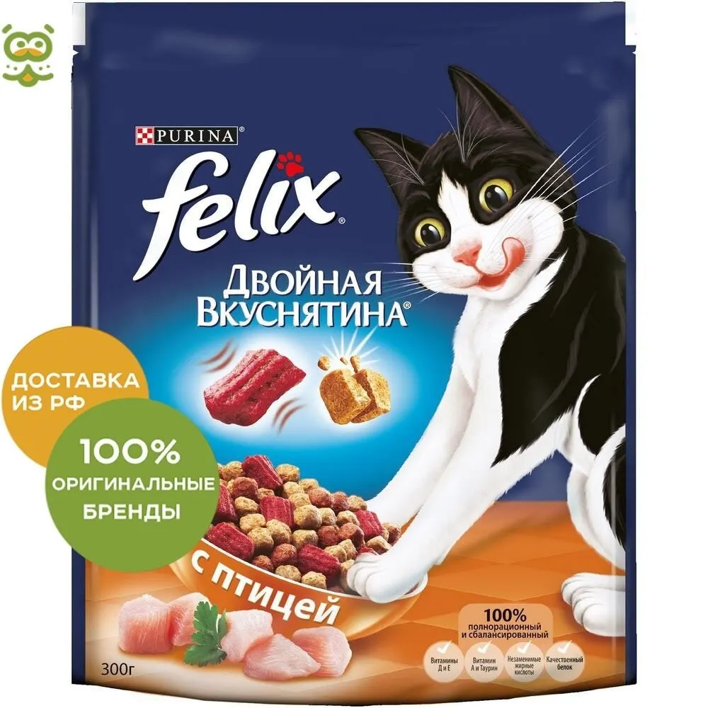 FELIX® Двойная Вкуснятина® – новый сухой корм для кошек, который полностью соответствует потребностям Вашего озорника. Восхитительное сочетание двух текстур в одной упаковке: хрустящие гранулы смешаны с мягкими кусочками для создания невероятного вкуса, перед которым невозможно устоять!