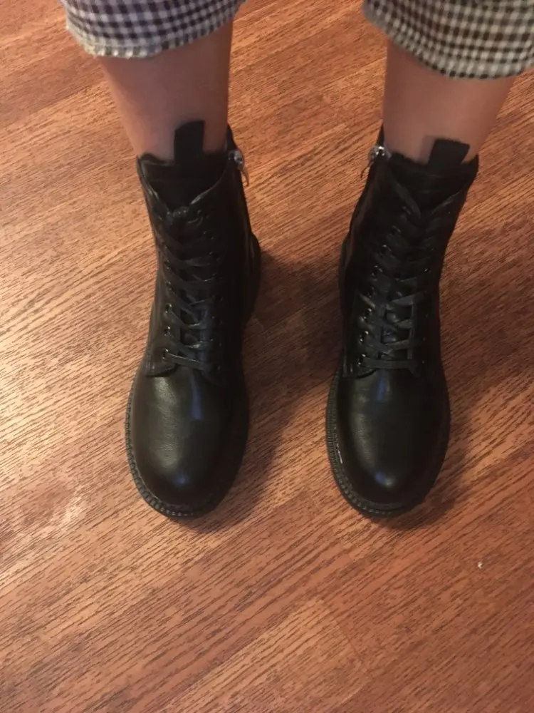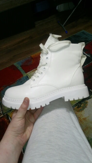 Ботинки супер! смотрятся очень стильно и красиво! на улицу ещё не выгуливала, посмотрим как будут в носке. размер стопы 22.5, стандартный 35 р. сели идеально, даже можно ещё носок потеплее впихнуть.