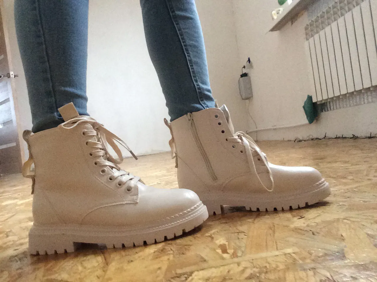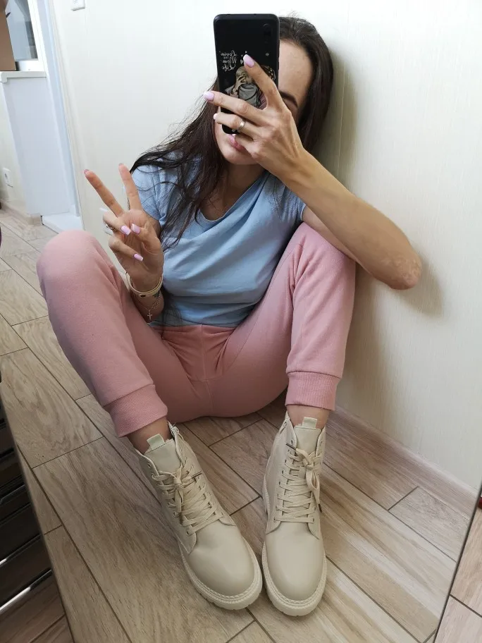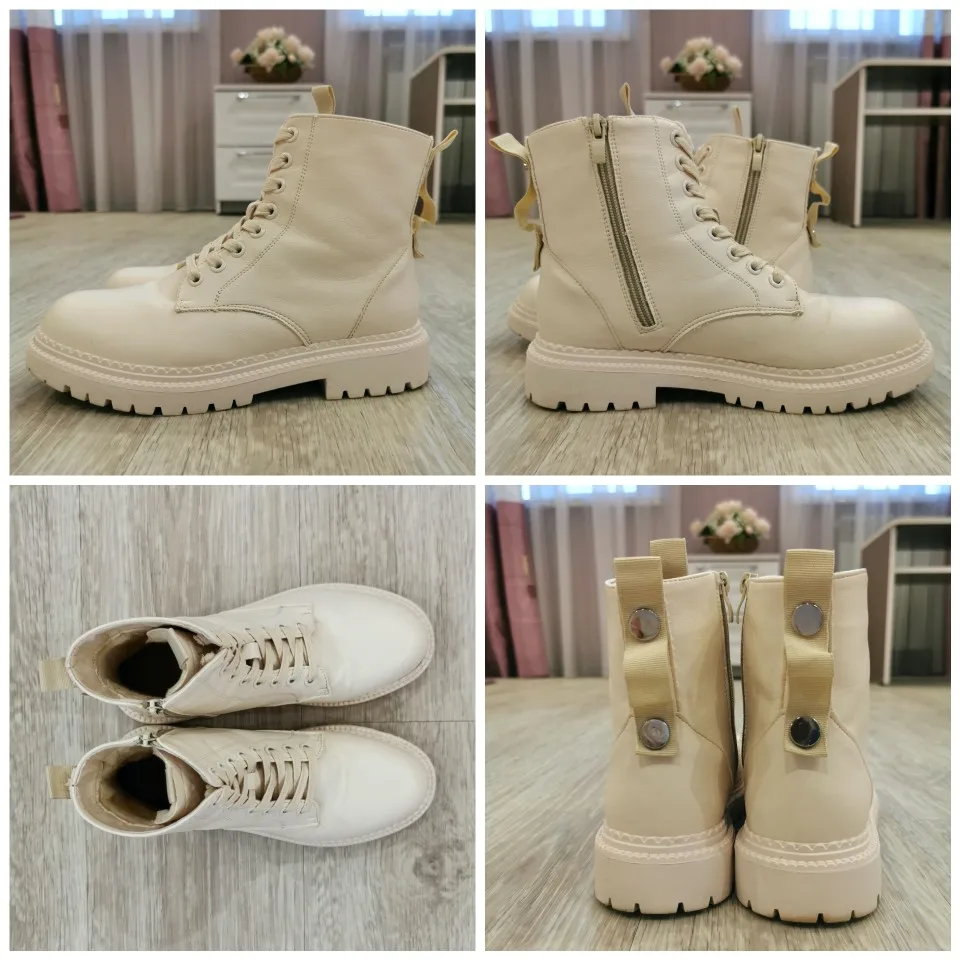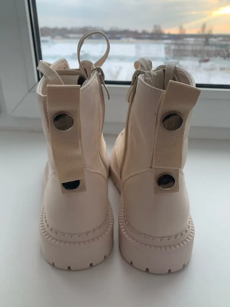 Ухууу получила я эти шикарные ботики всего за неделю! Цвет прям как надо : нежный бежевый. Кожа мягкая, следов клея нет, сшиты очень аккуратно. Но я пожалела, что взяла с мехом, так как вышла бы в них на улицу прям сейчас!!!)) с другой стороны как похолодает, можно уже будет носить. Наконец-то, замок сбоку, не надо постоянно шнурки завязывать. Мой размер обычно 38, по стопе 24,5 см. По отзывам взяла больше - 39 размер и 25см! Подошли идеально! Читайте отзывы, ориентируйтесь на них. Не совсем поняла зачем сзади эти заклёпки, видимо, дизайн такой. Короче, наверное, ещё чёрные такие закажу)