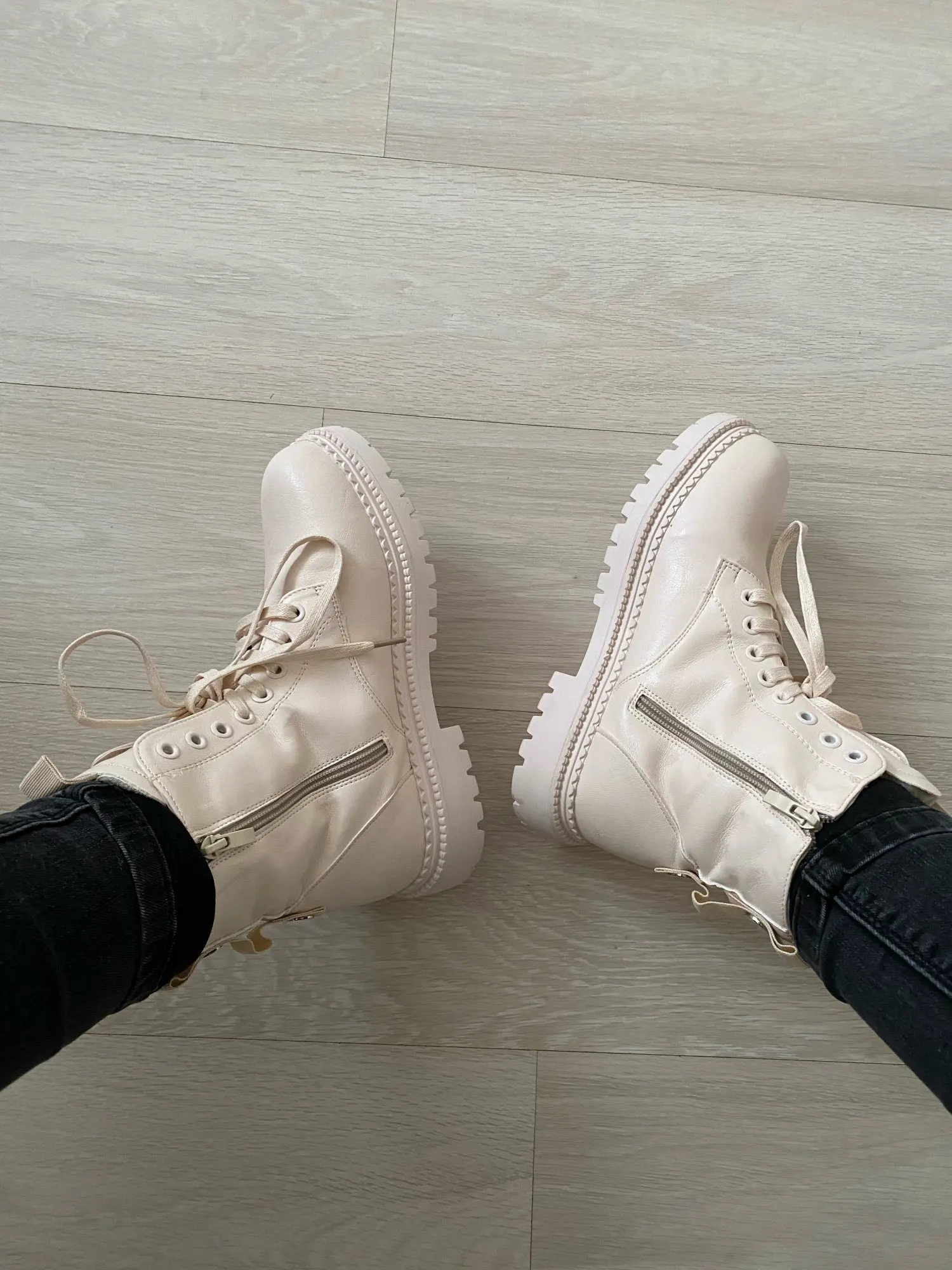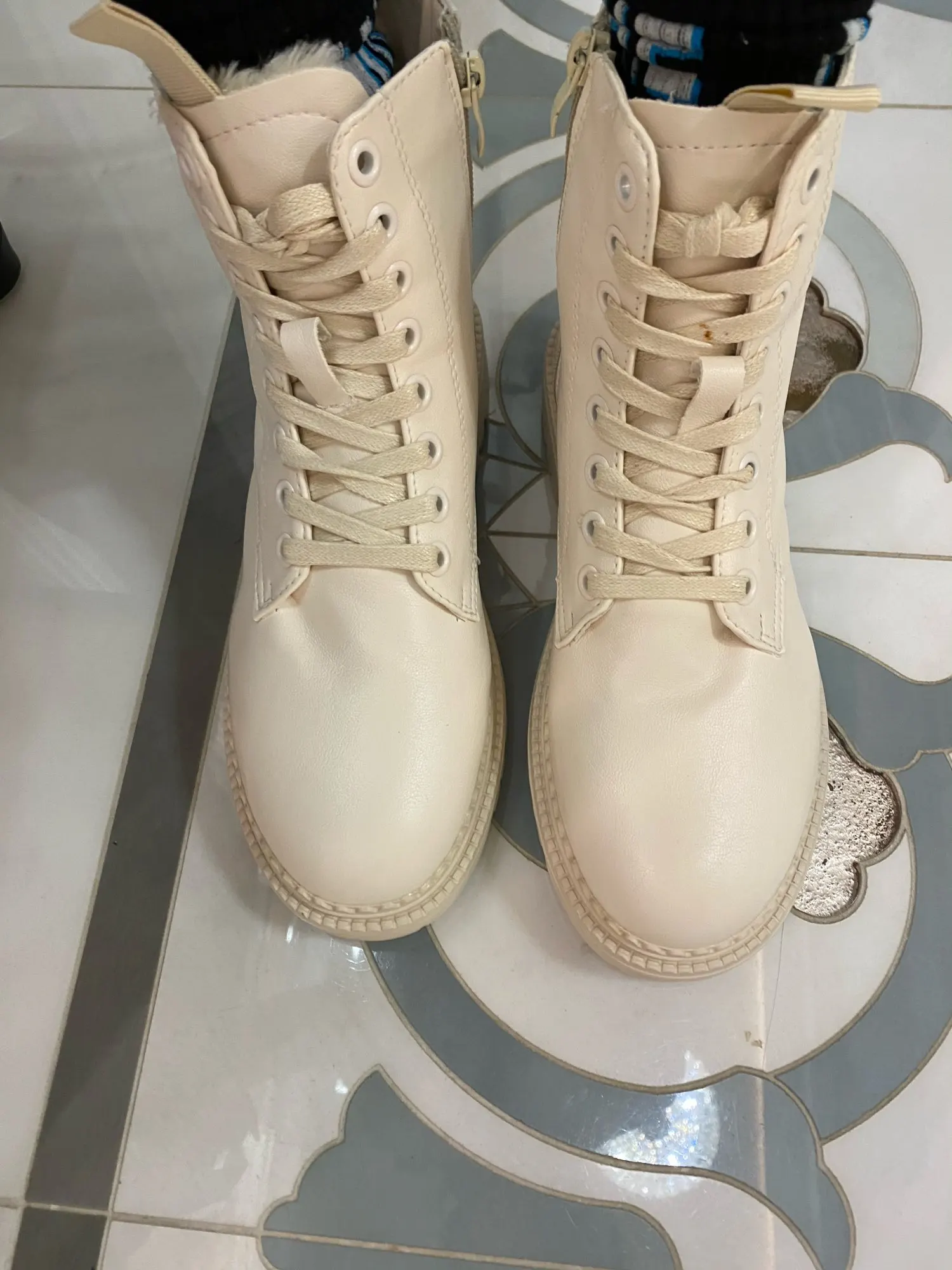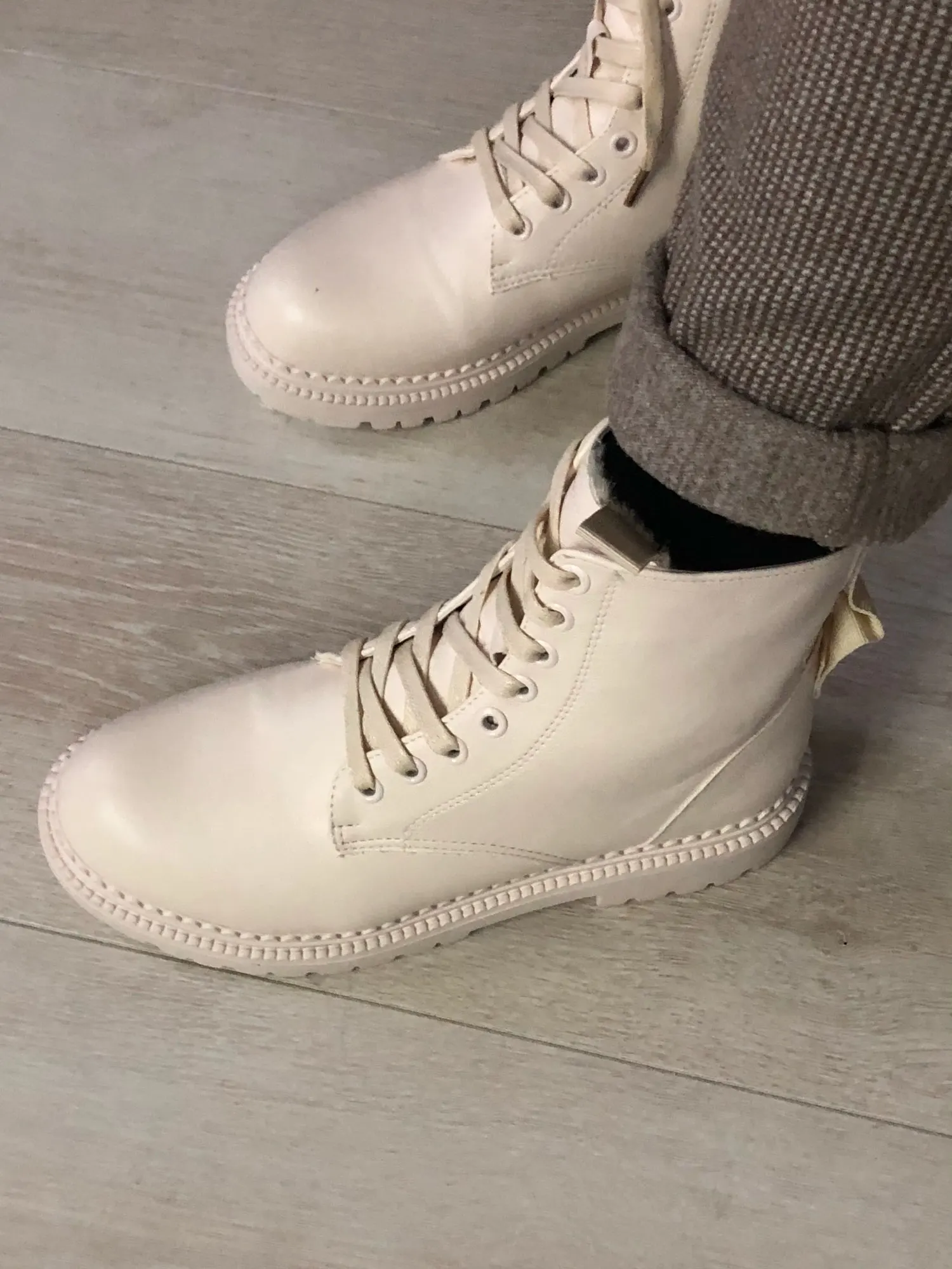 Ухууу получила я эти шикарные ботики всего за неделю! Цвет прям как надо : нежный бежевый. Кожа мягкая, следов клея нет, сшиты очень аккуратно. Но я пожалела, что взяла с мехом, так как вышла бы в них на улицу прям сейчас!!!)) с другой стороны как похолодает, можно уже будет носить. Наконец-то, замок сбоку, не надо постоянно шнурки завязывать. Мой размер обычно 38, по стопе 24,5 см. По отзывам взяла больше - 39 размер и 25см! Подошли идеально! Читайте отзывы, ориентируйтесь на них. Не совсем поняла зачем сзади эти заклёпки, видимо, дизайн такой. Короче, наверное, ещё чёрные такие закажу)