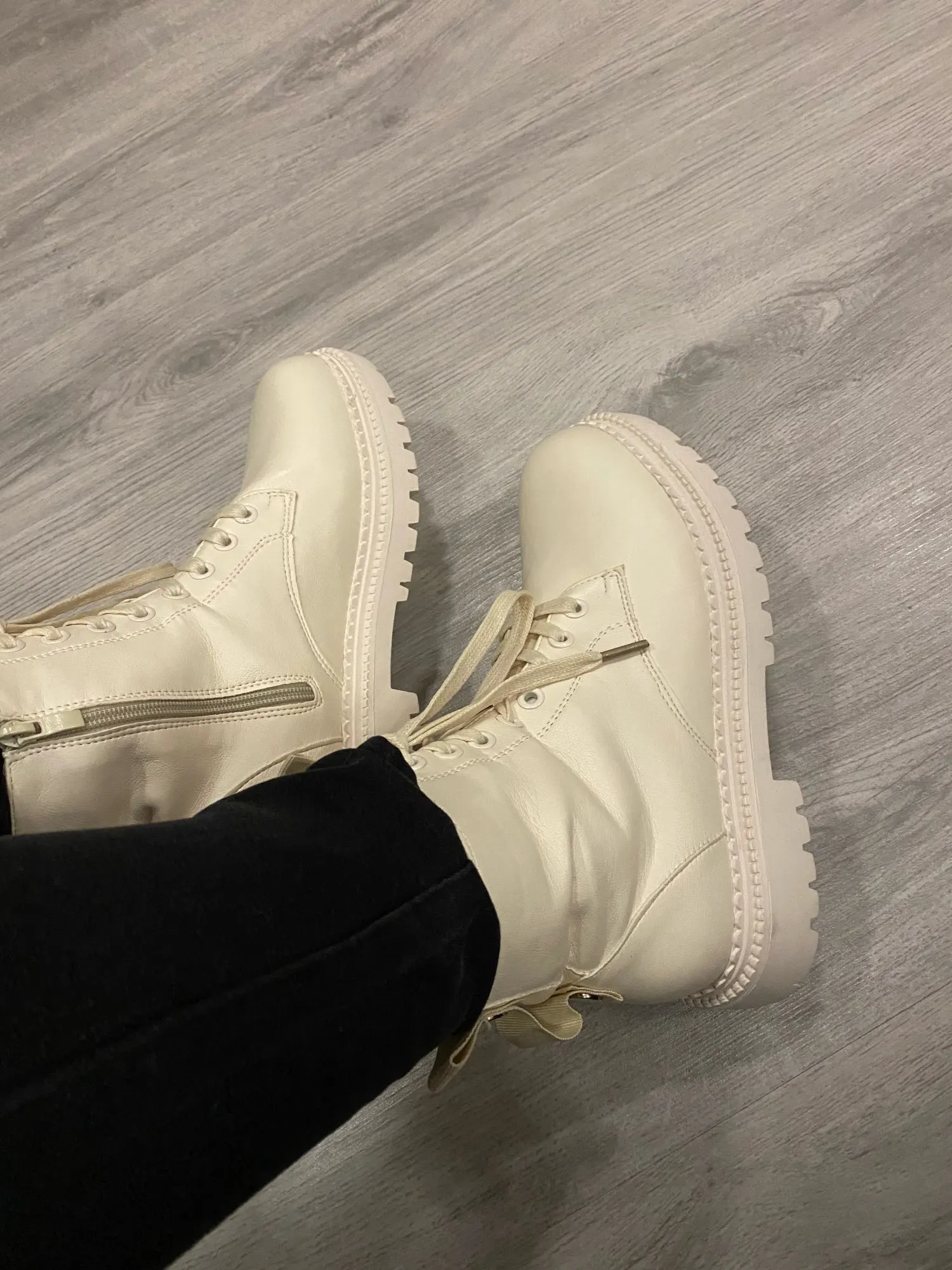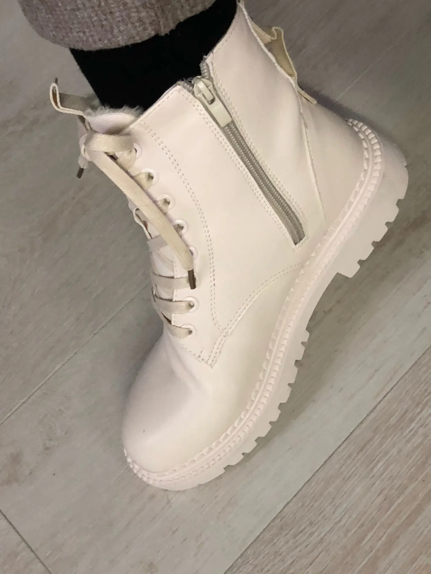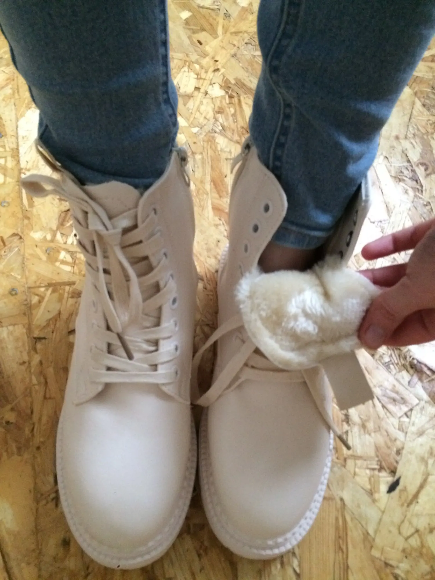 Офигенные ботинки, молочного цвета, на ноге смотрятся классно. Мех тонкий, сделаны из Эко кожи, но хорошего качества. Пришли не помятые. Очень довольна. Рекомендую.