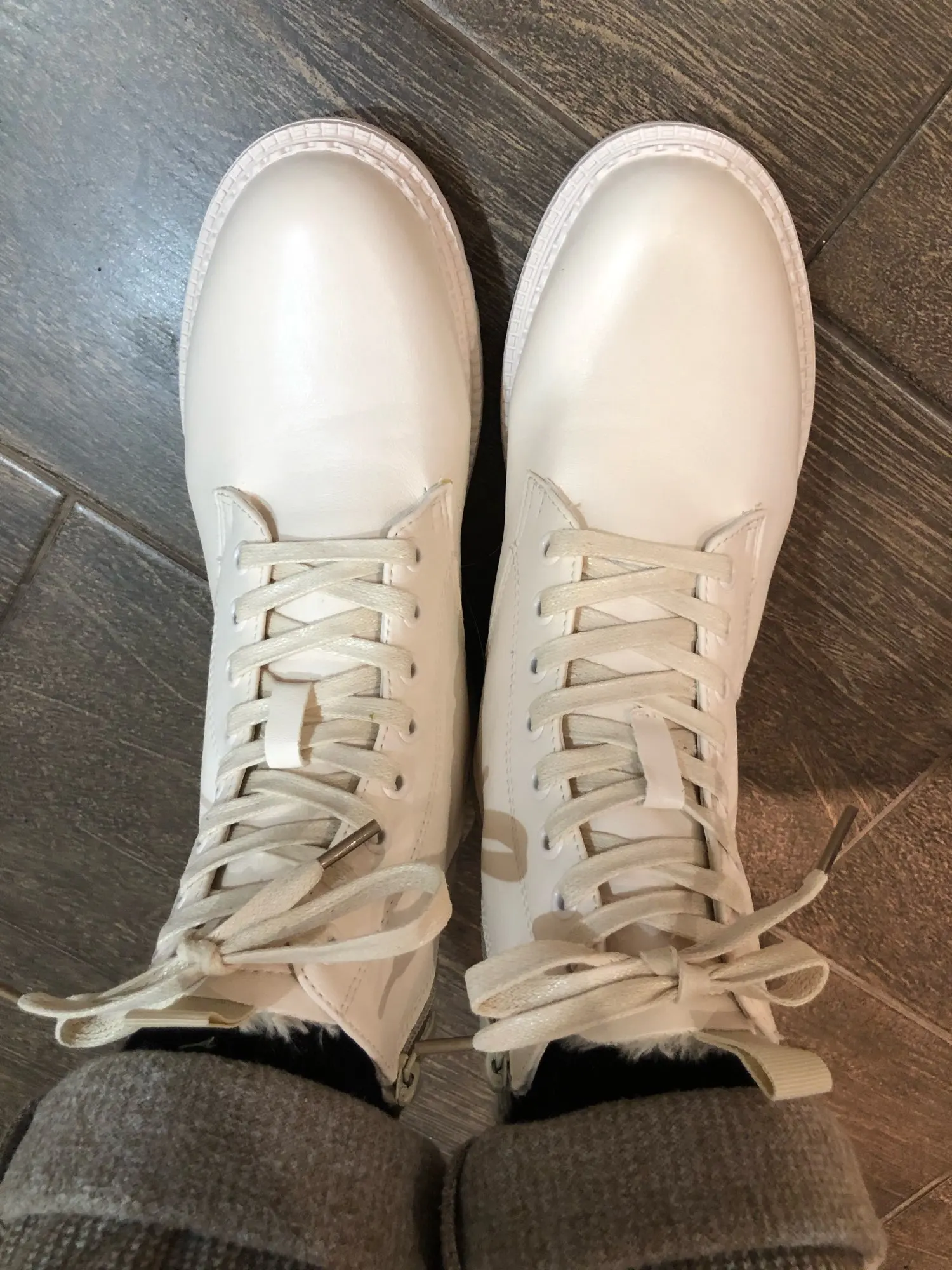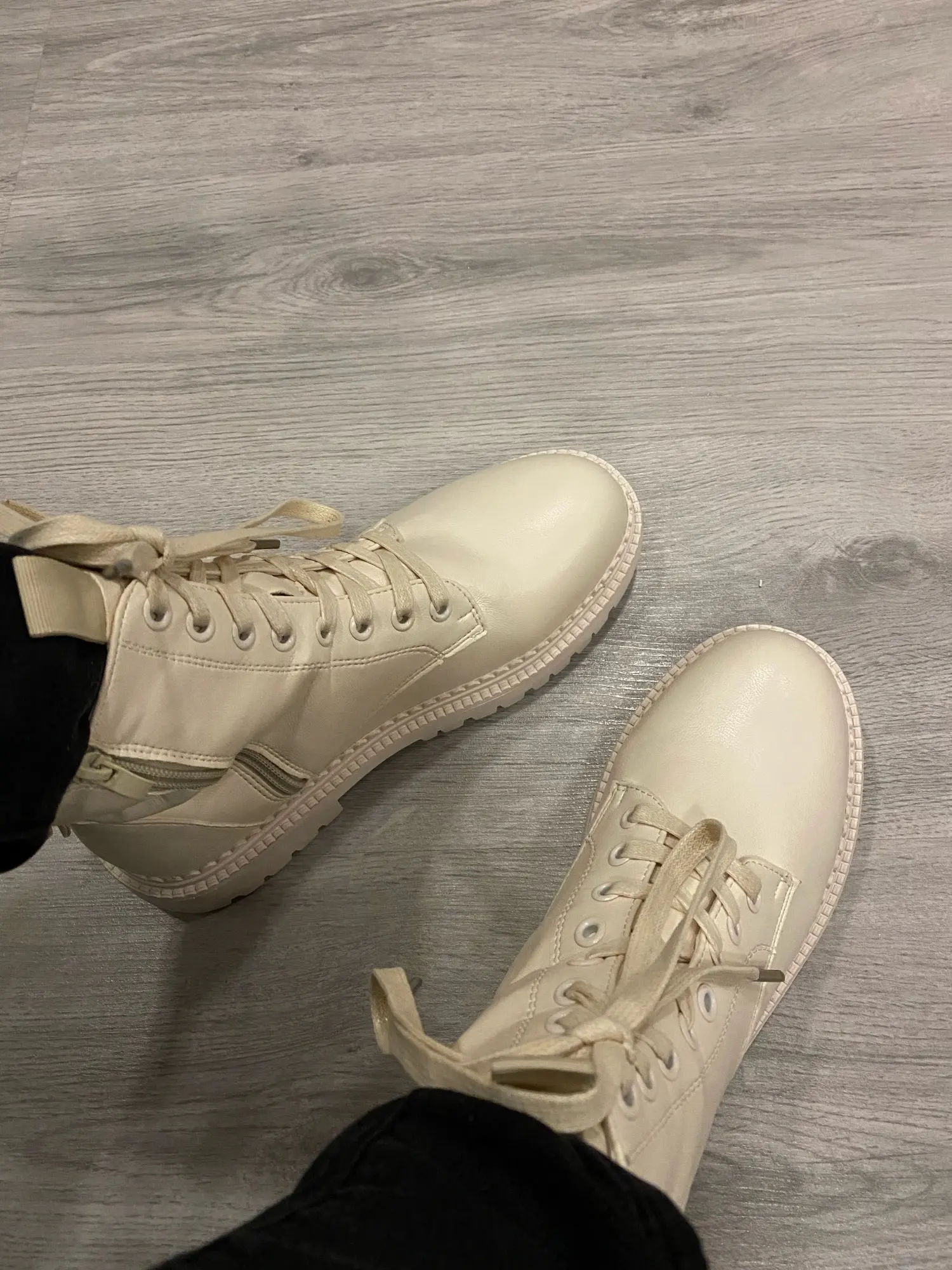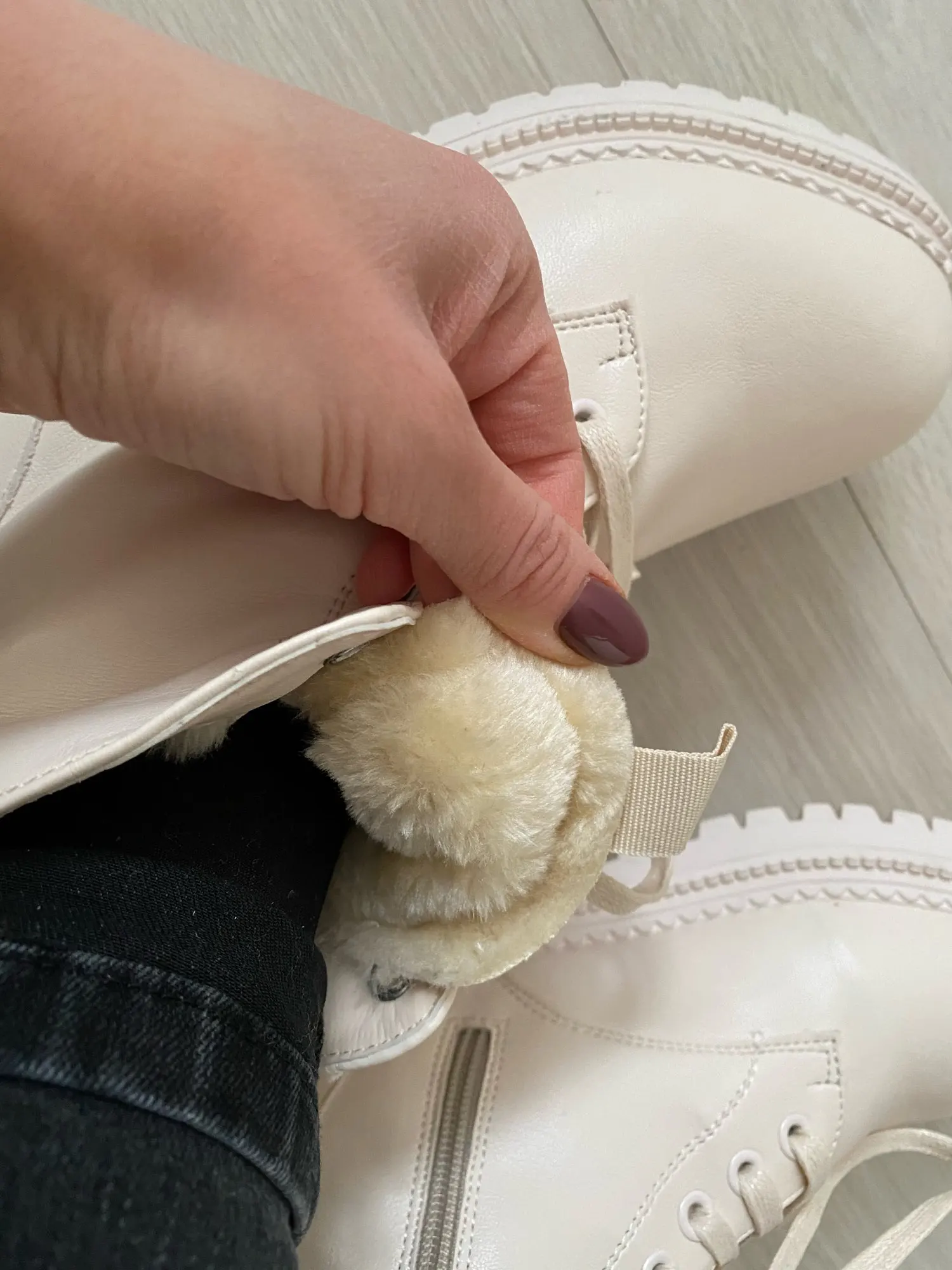Офигенные ботинки, молочного цвета, на ноге смотрятся классно. Мех тонкий, сделаны из Эко кожи, но хорошего качества. Пришли не помятые. Очень довольна. Рекомендую.
