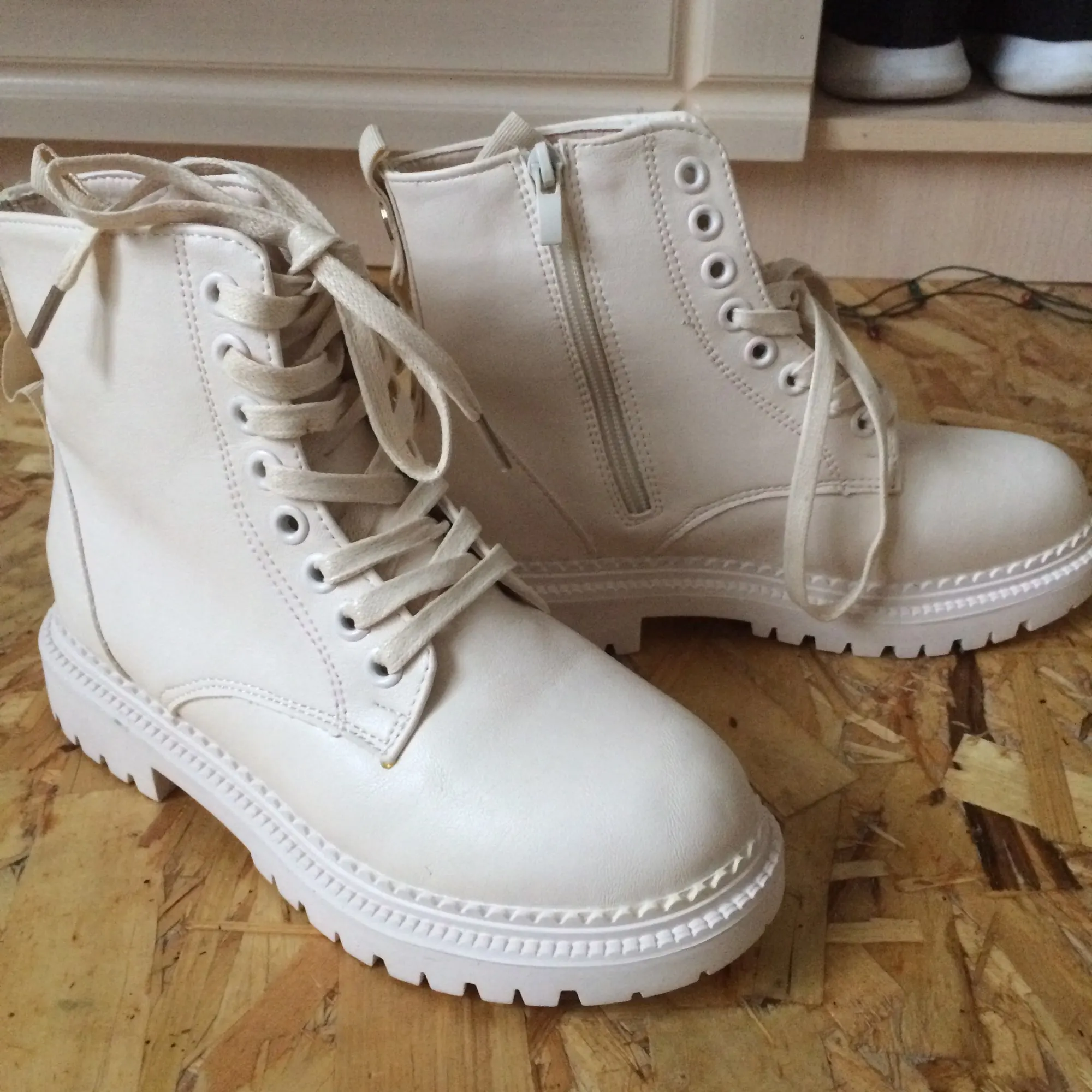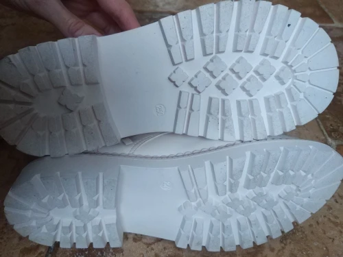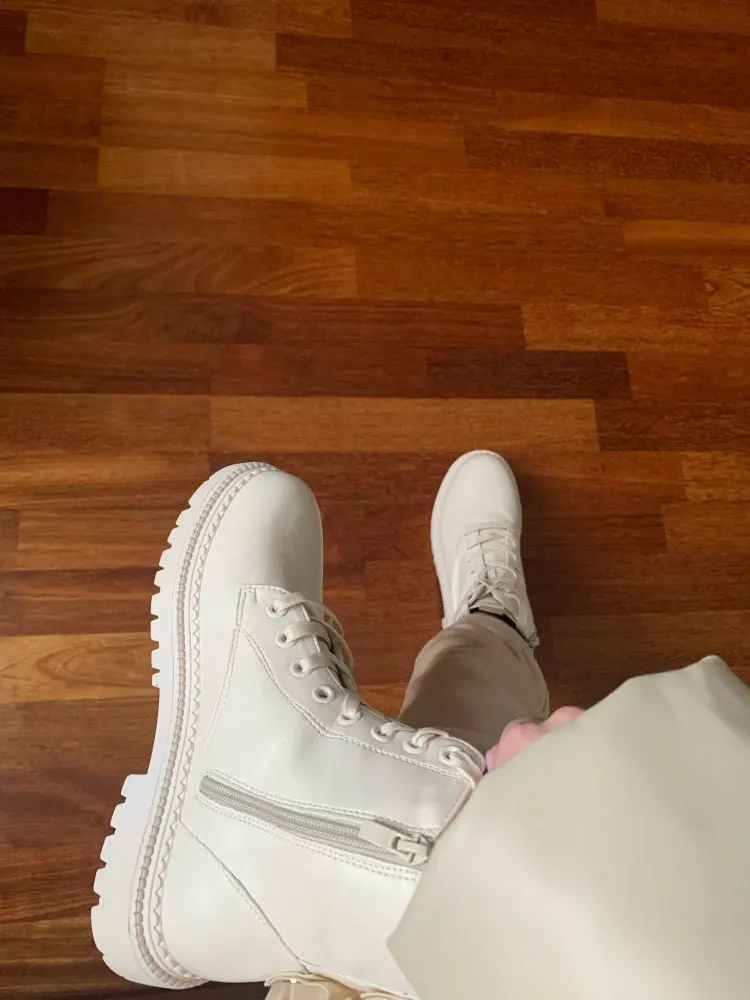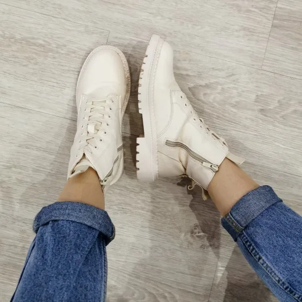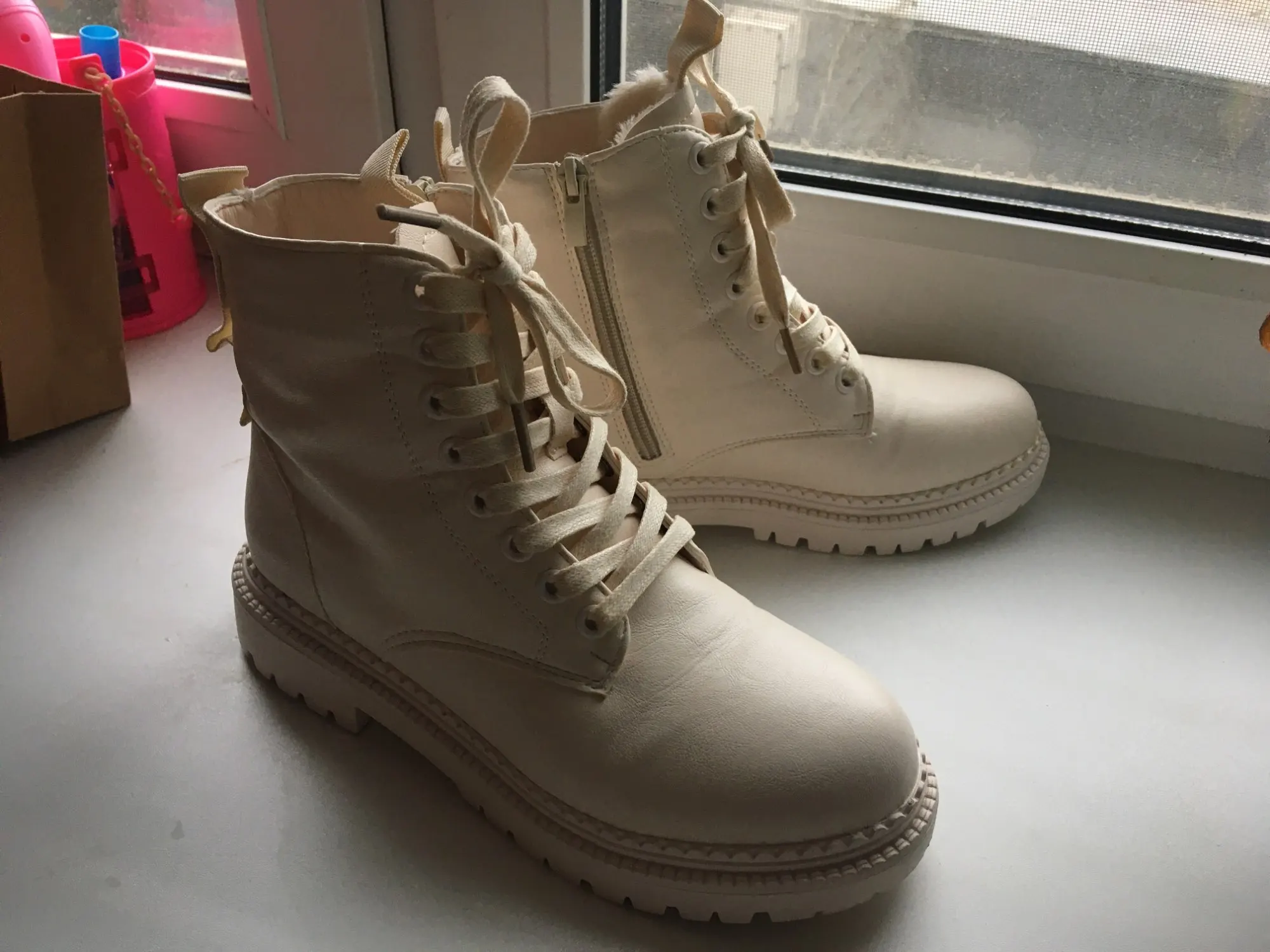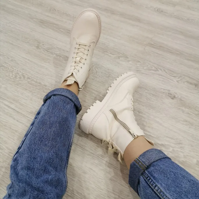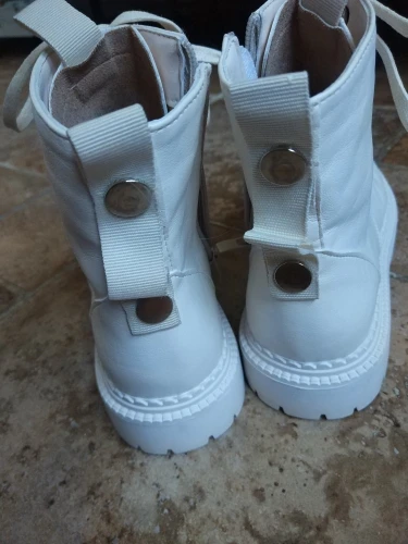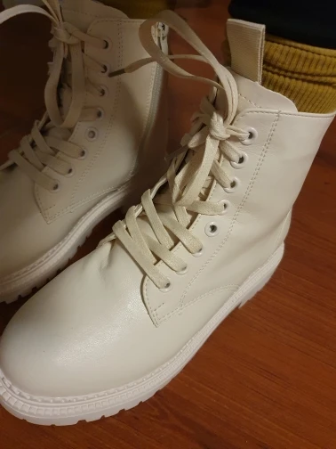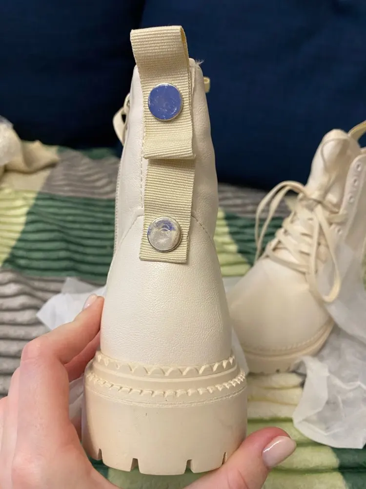 Ботинки из кожзама, на молнии, внутри искусственный мех. Цвет молочный. Все фото после трёх недель использования. Кожзам мягкий, тактильно приятный, фактура визуально напоминает кожу. Мех тонкий, ворс короткий и жиденький, поначалу боты страдали линькой, через пару дней стресс прошёл))). Шнурки плоские вощёные. Молния работает исправно. Подошва резиновая, хорошо гнётся (приклеена - не прошита!). В рисунок на подошве отлично забивается грязь (пластиковый коврик-травка при входе в дом не справляется). Но, отмечу, что подошва, да и сами боты, отлично моются, и боковая поверхность подошвы не желтеет (есть с чем сравнивать). При распаковке сильно пахли клеем, через пару дней - нормуль. По пошиву и прочему претензий нет - всё около дела. Единственное, у меня одна клёпка на пятке оторвалась, но это уж я сама дёрнула резко, обратно воткнуть у меня не получилось - приклеила. Но это говорит о том, что кожзам очень мягкий.