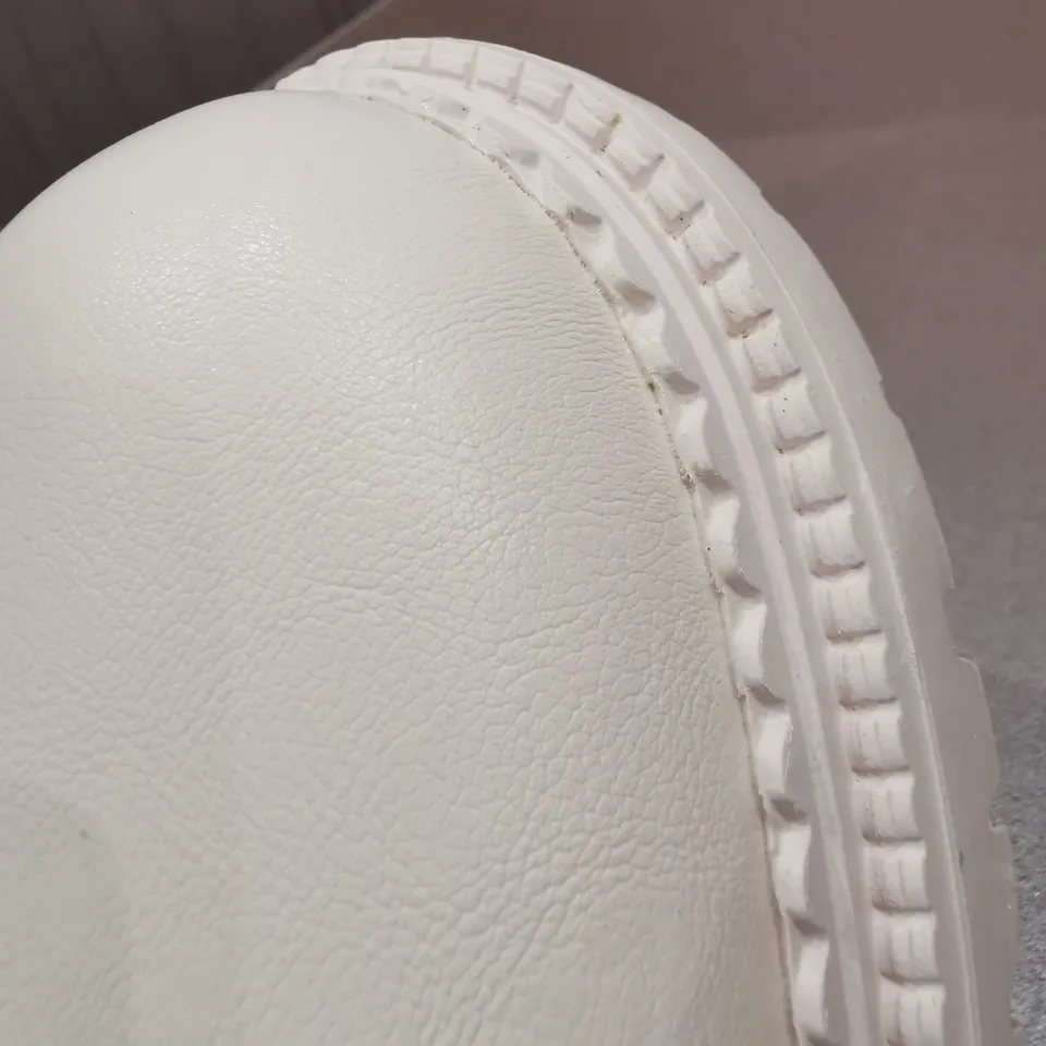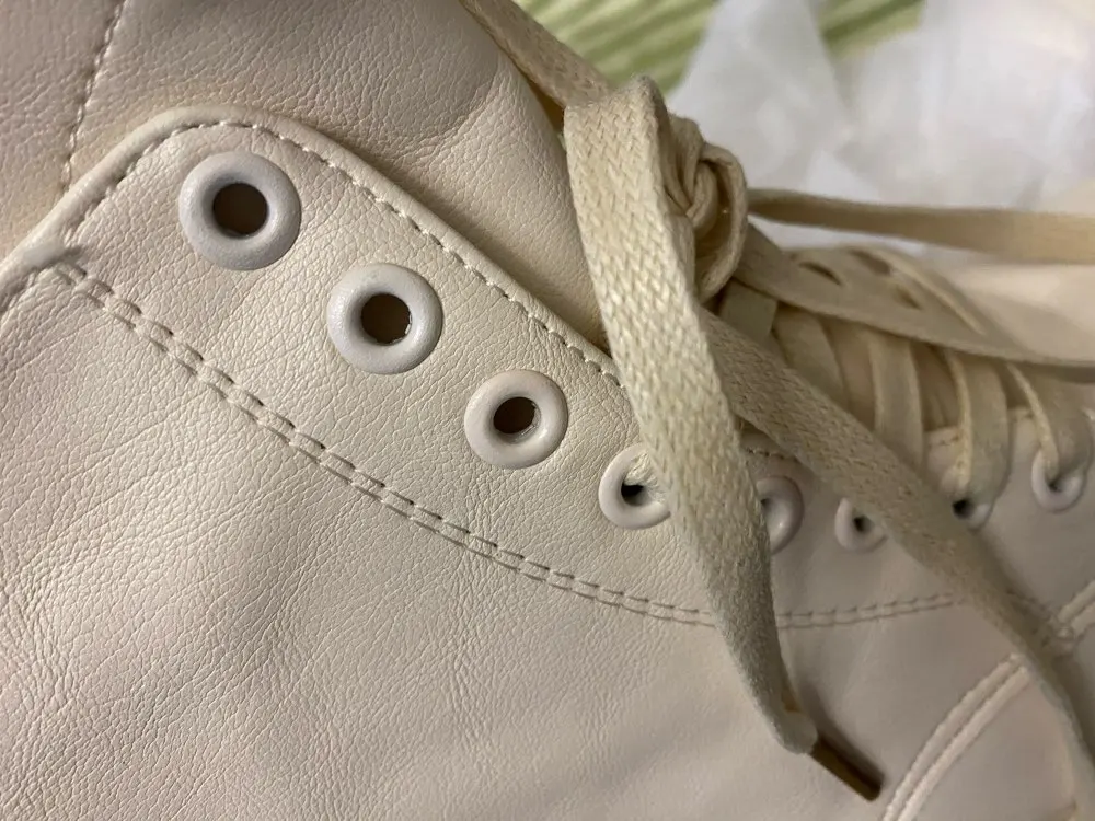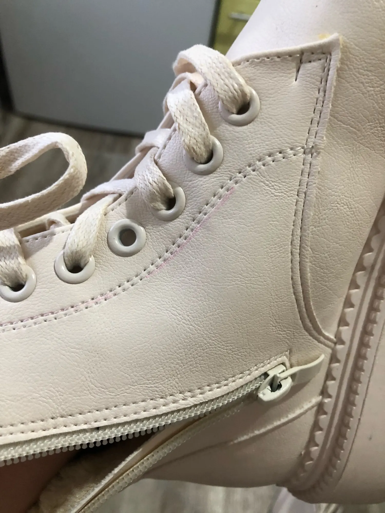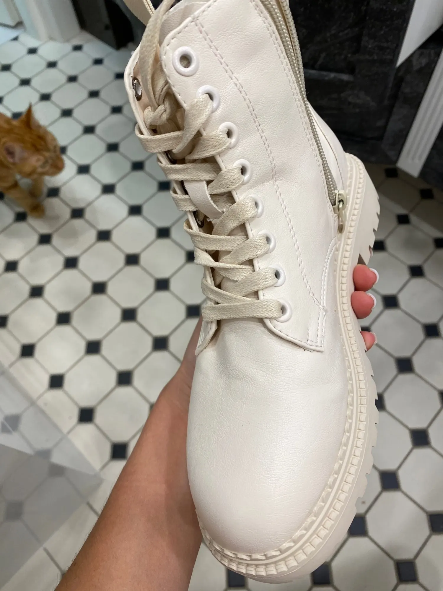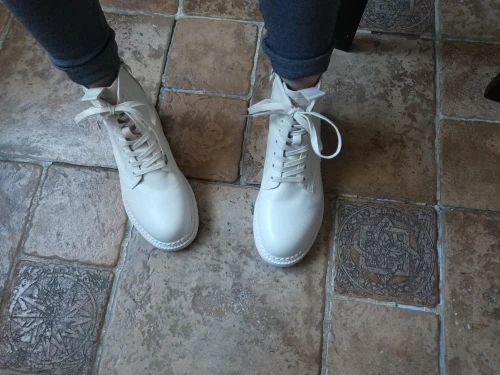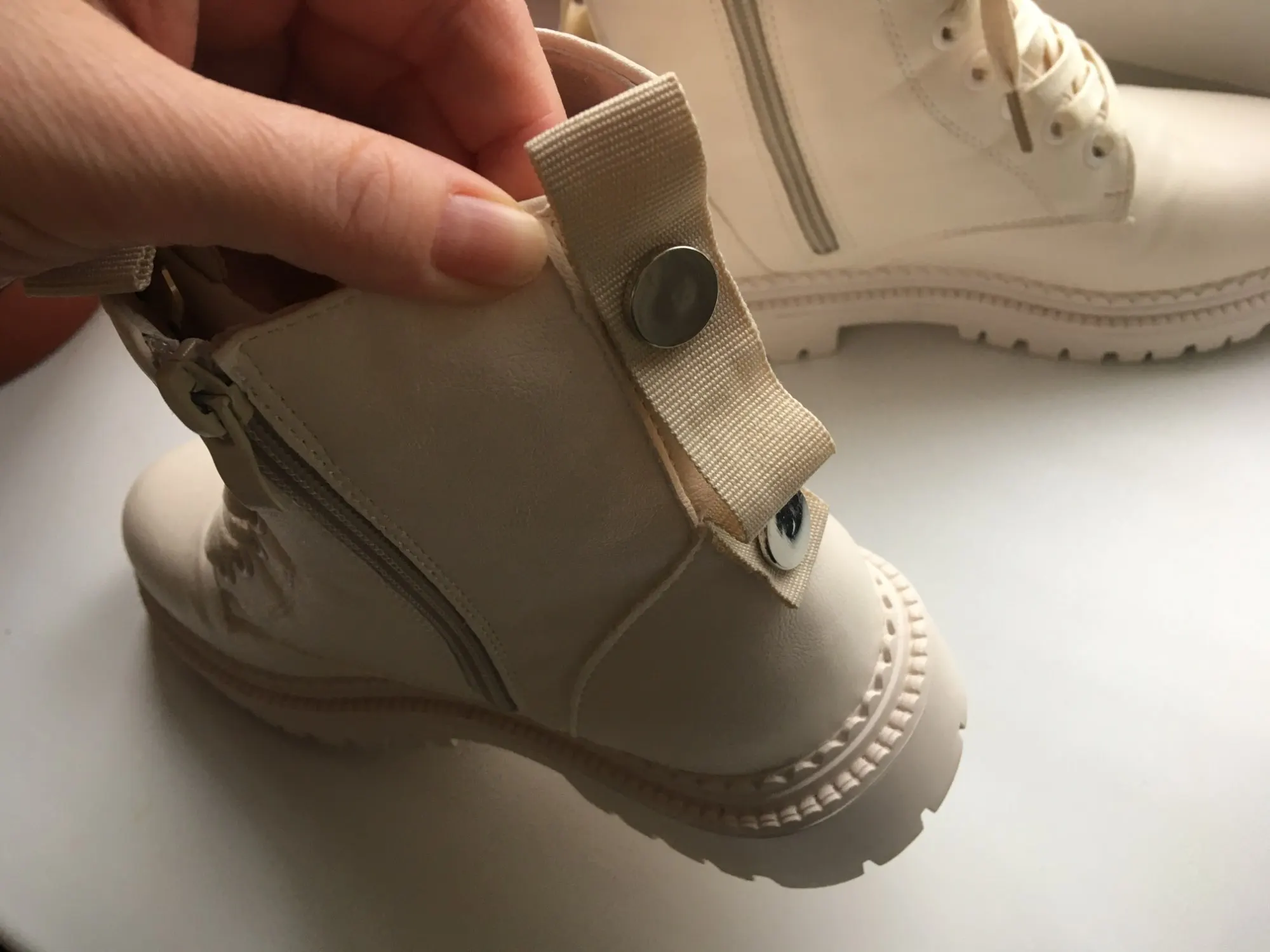 Ботинки из кожзама, на молнии, внутри искусственный мех. Цвет молочный. Все фото после трёх недель использования. Кожзам мягкий, тактильно приятный, фактура визуально напоминает кожу. Мех тонкий, ворс короткий и жиденький, поначалу боты страдали линькой, через пару дней стресс прошёл))). Шнурки плоские вощёные. Молния работает исправно. Подошва резиновая, хорошо гнётся (приклеена - не прошита!). В рисунок на подошве отлично забивается грязь (пластиковый коврик-травка при входе в дом не справляется). Но, отмечу, что подошва, да и сами боты, отлично моются, и боковая поверхность подошвы не желтеет (есть с чем сравнивать). При распаковке сильно пахли клеем, через пару дней - нормуль. По пошиву и прочему претензий нет - всё около дела. Единственное, у меня одна клёпка на пятке оторвалась, но это уж я сама дёрнула резко, обратно воткнуть у меня не получилось - приклеила. Но это говорит о том, что кожзам очень мягкий.