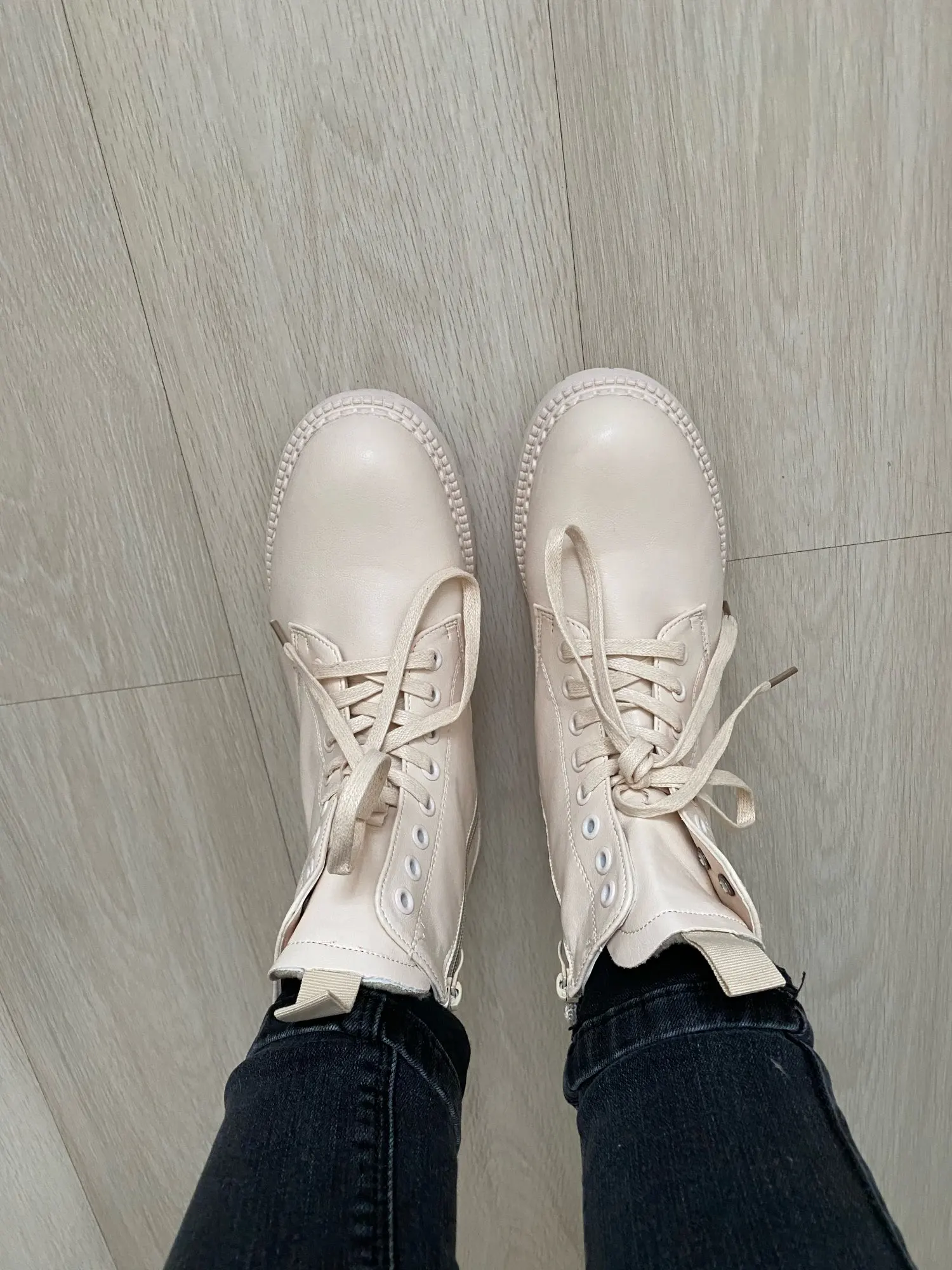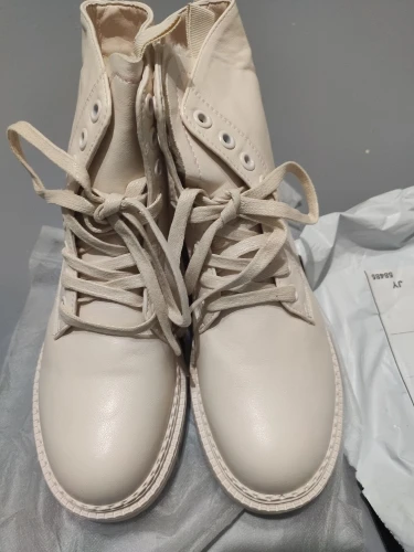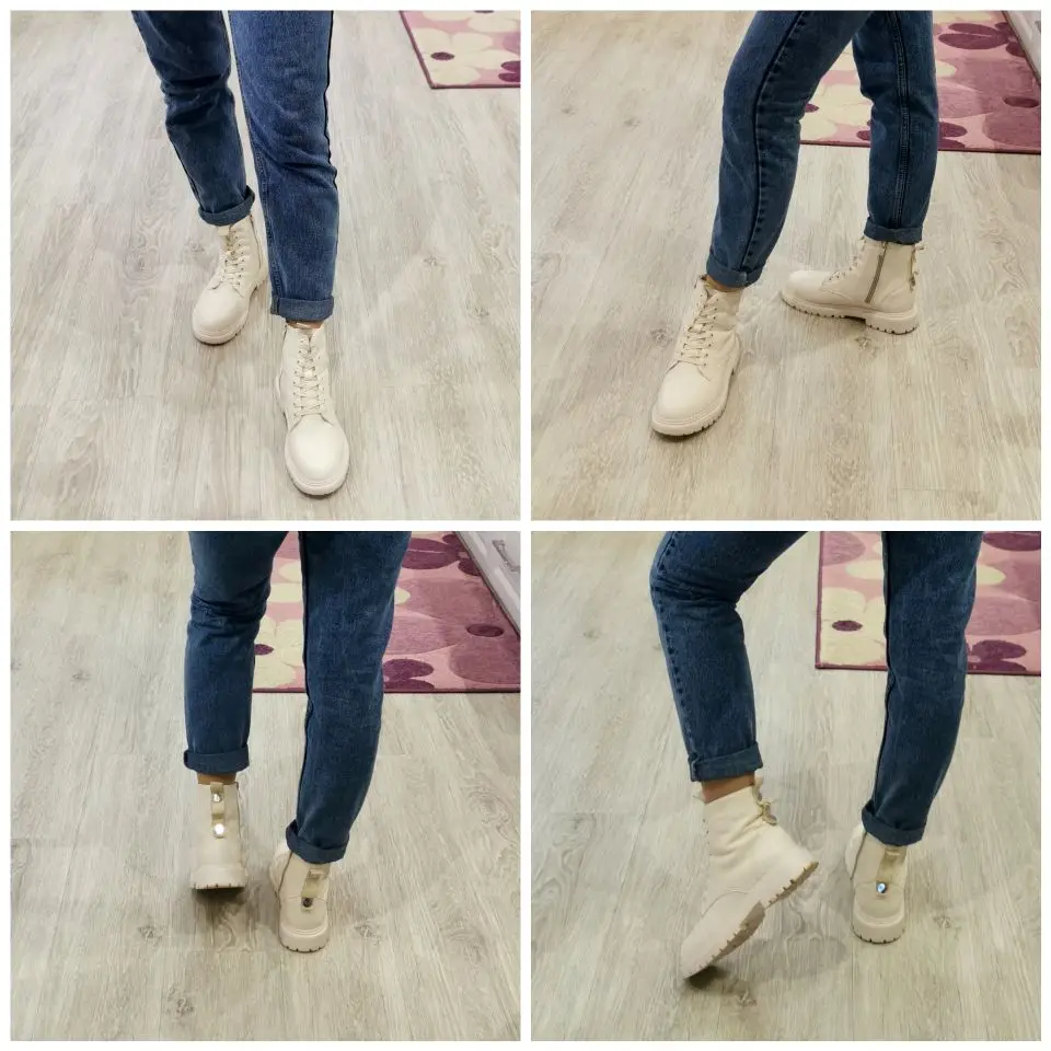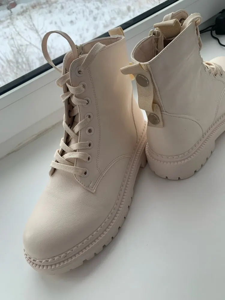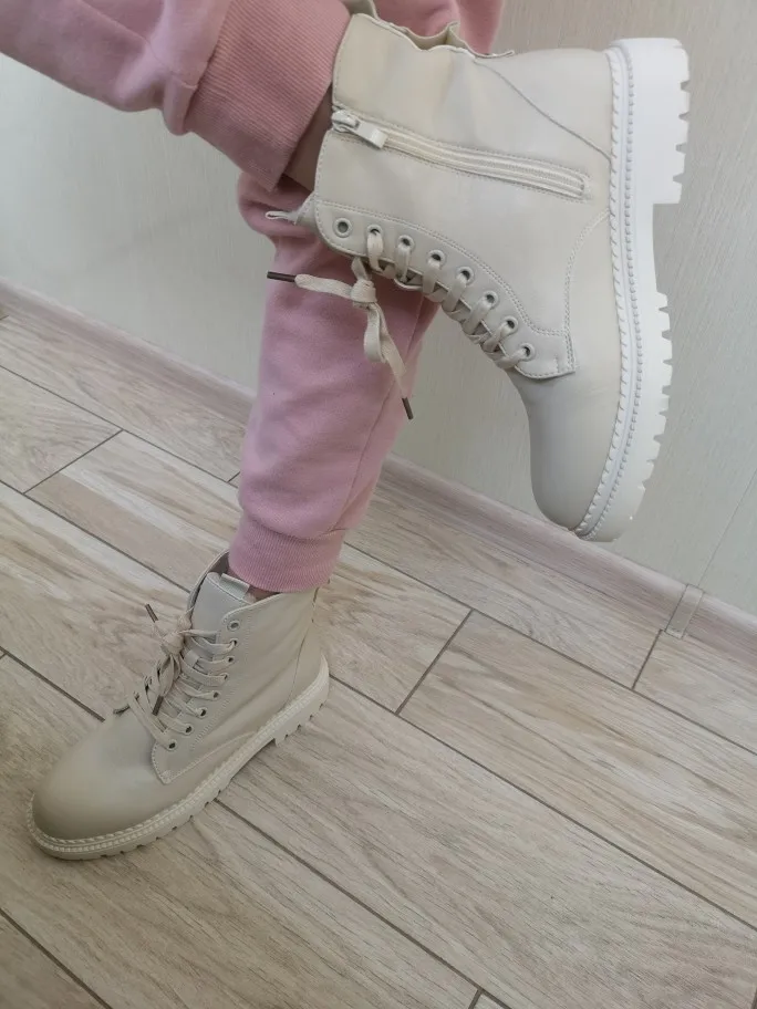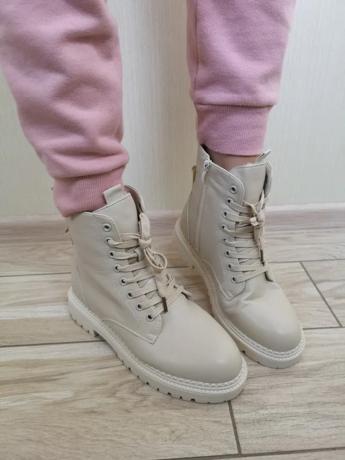 Ботинки понравились. Цвет напоминает топленое молоко. Они очень лёгкие, ноге комфортно. Кож.зам мягкий. На стопу 24 см. заказала размер 7 с плюшем, сели идеально, с оптимальным запасом, но на ноге не болтаются! Сложно сказать как они будут в нОске в нашем грязном городе, но выглядят очень классно. Продавца рекомендую! В период распродаж приехали быстро!