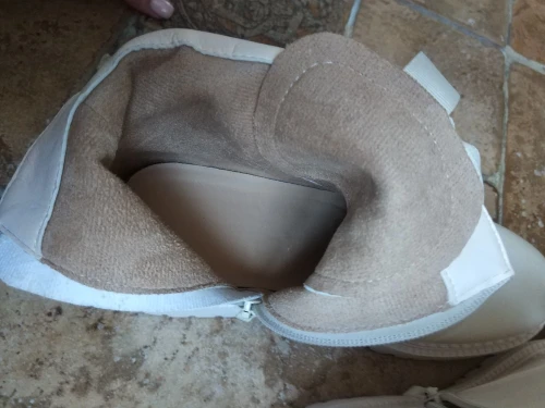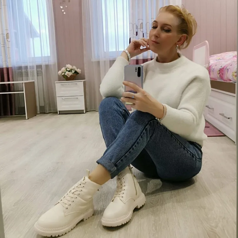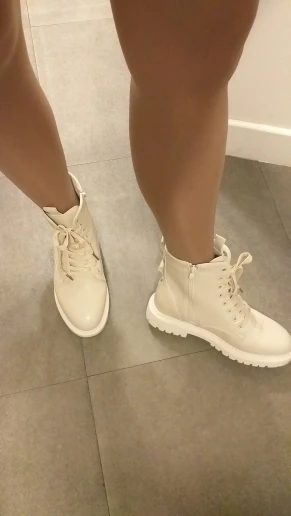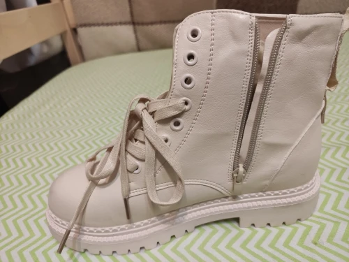 Отличные ботинки - цвет очень красивый, сливочный крем. Мягкий кож.зам и плюш внутри. У меня маленькая нога 23 см, с низким подъемом, с учетом утеплителя взяла 23,5 см. - оказался свободным(влезет ещё тёплый вязанный носок), что будет кстати на морозы, т.к. по первому дню носки кажется, что они не сильно тёплые(кож.зам тонкий), погода на улице была -2. Объём в голени регулируется с помощью шнурков, что весьма удобно и я брала с боковой молнией, что бы каждый раз путаться со шнуровкой. Лента на задниках ботинок помогает легко одевать их, заметила такую же ленту на язычке - так же тяну за неё, что бы поправлять его, если он сполз в сторону или вглубь ботинка.