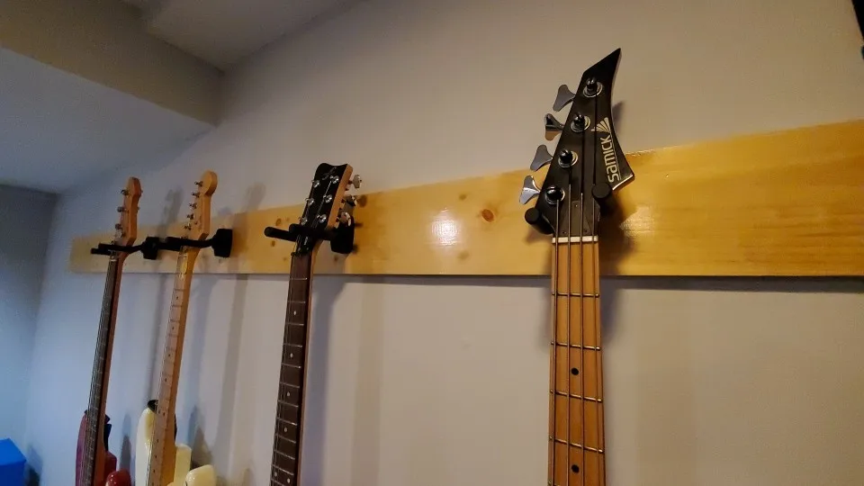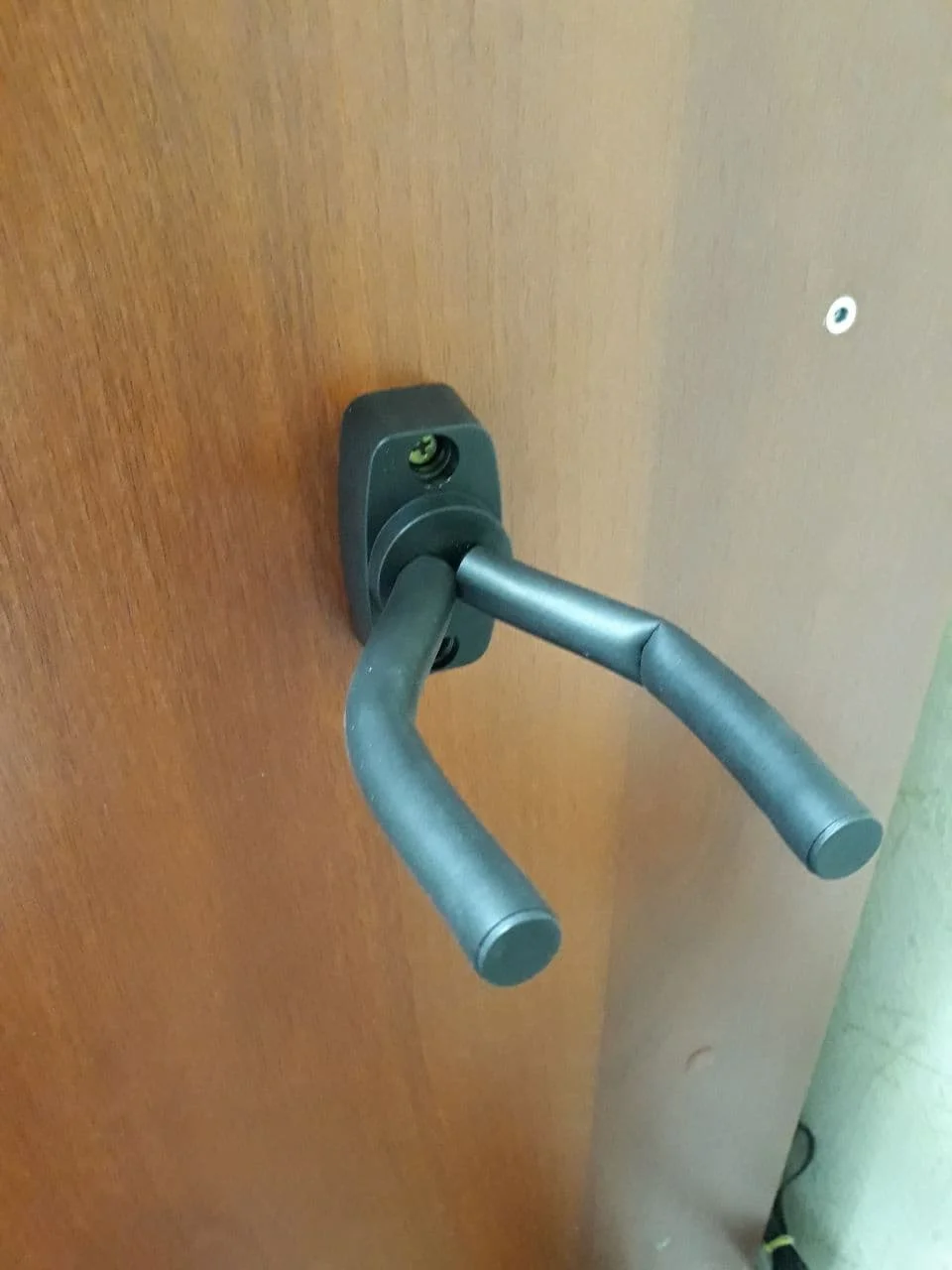 отличная вещь. крепится на саморезы к стене. Планки рогатины прочные, гитару держат даже в чехле. У меня чехол чёрный, рогатульки не видно вовсе, впечатление, что гитара просто сама висит на стене. Супер. Спасибо!