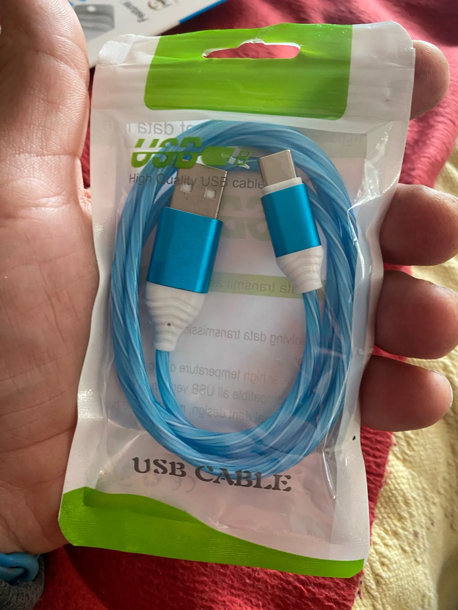 Обычный светодиодный кабель. Поддержка быстрой зарядки отсутствует, но это компенсируется классной подсветкой кабеля. Товар пришёл за ~16 дней, только из-за совместной доставки с другим товаром