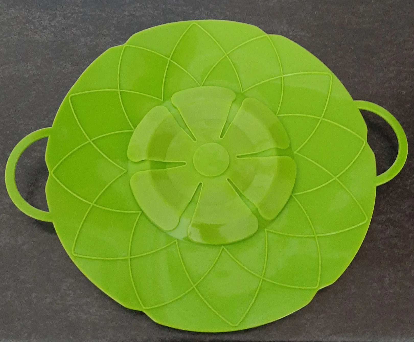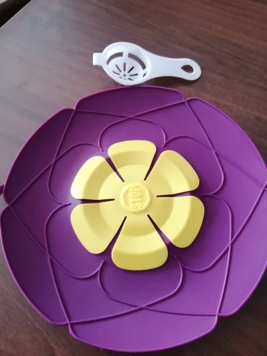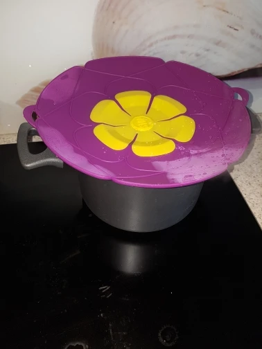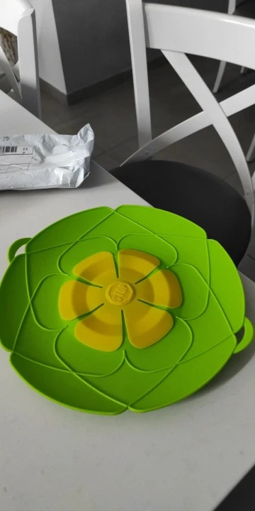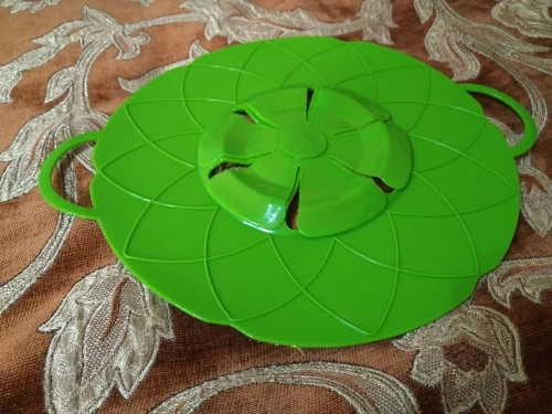 Хорошая крышка-невыкипайка. Из матового нескользящего силикона, тяжелое по весу. В работе показывает себя хорошо: при кипении вода понимается через лепестки и не выливается через края. Заказом доволен.