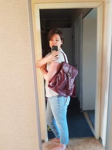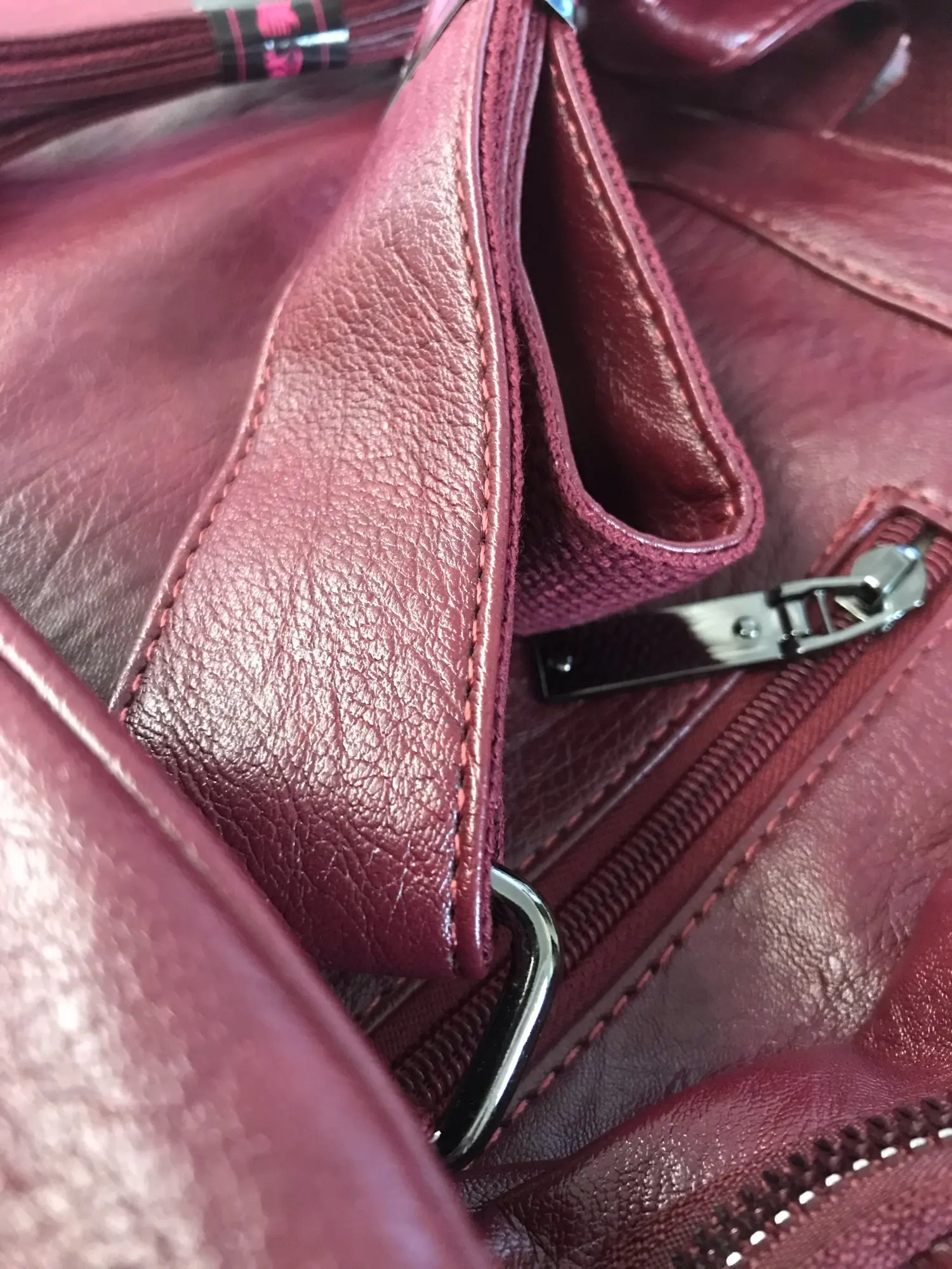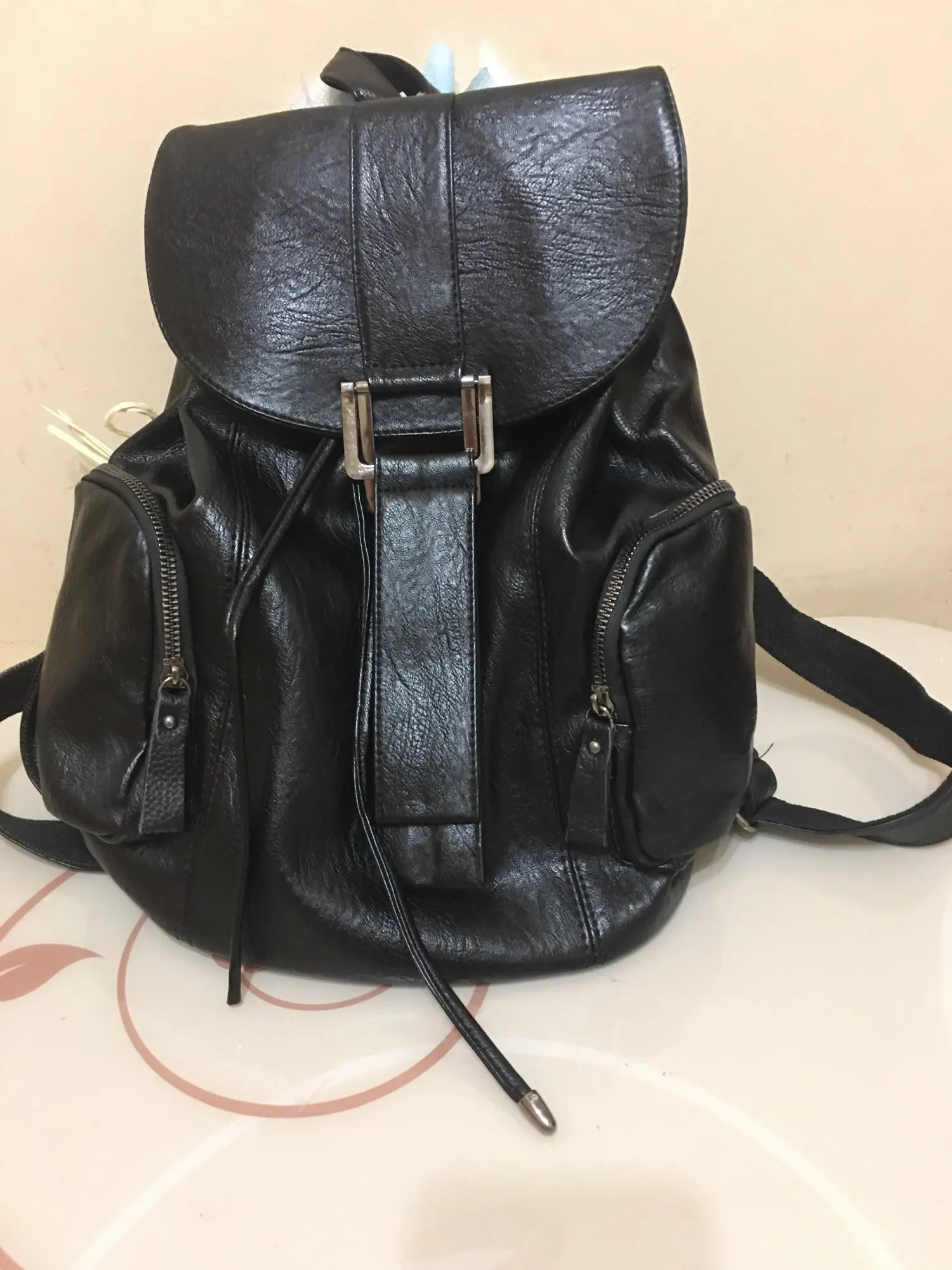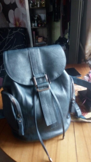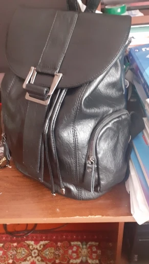 Рюкзаком довольна! компактный . Много карманов внутри и снаружи. Металлическая пряжка очень украшает. Все хорошо прошито. единственно. что не понравилось. это качество молний. Есть резкий запах от кожи или же другого. Ткань внутри выглядит дешево. Рюкзак сшит не из натуральной кожи. на ощупь не совсем плотный. но выглядит под натуральную.