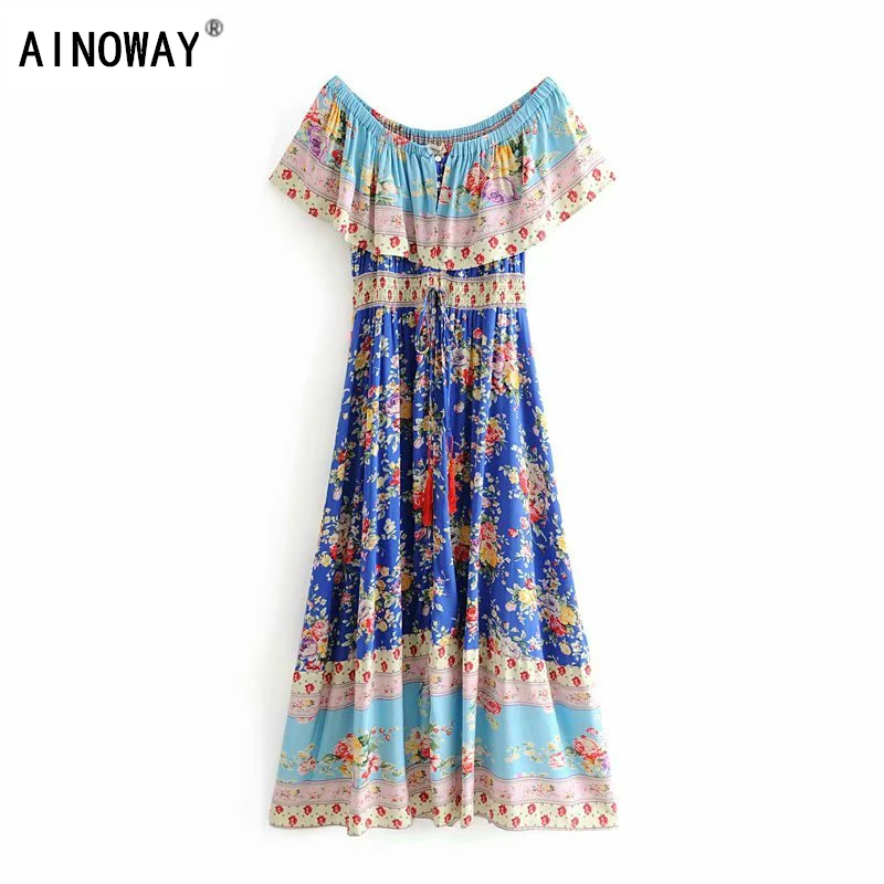 Винтажное шикарное женское платье с цветочным принтом роз, богемные платья с коротким рукавом, Женское Платье макси с открытыми плечами и кисточками из вискозы в стиле бохо, платья