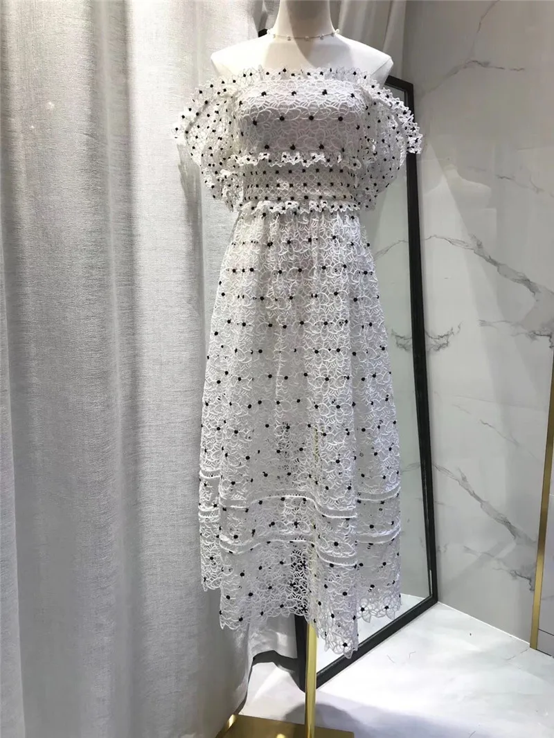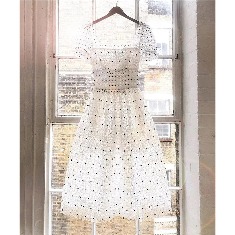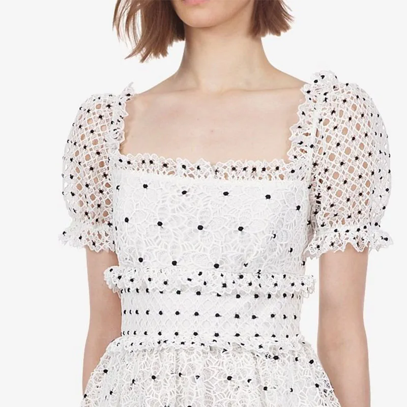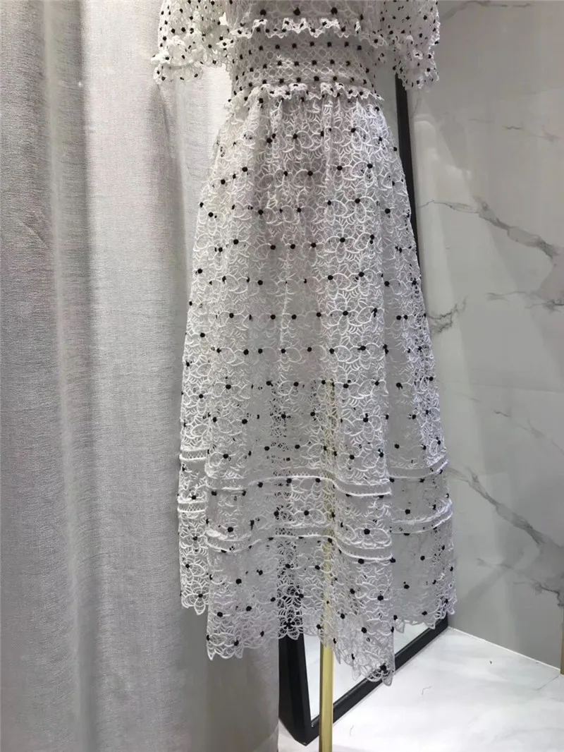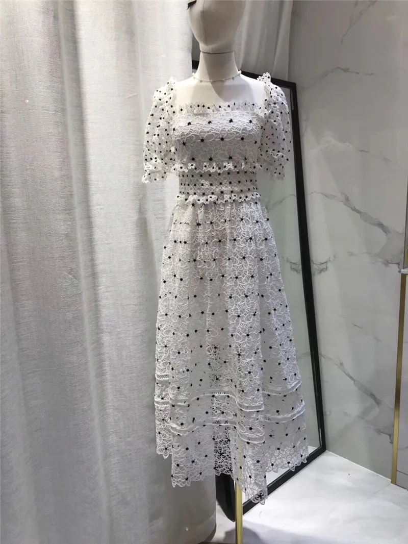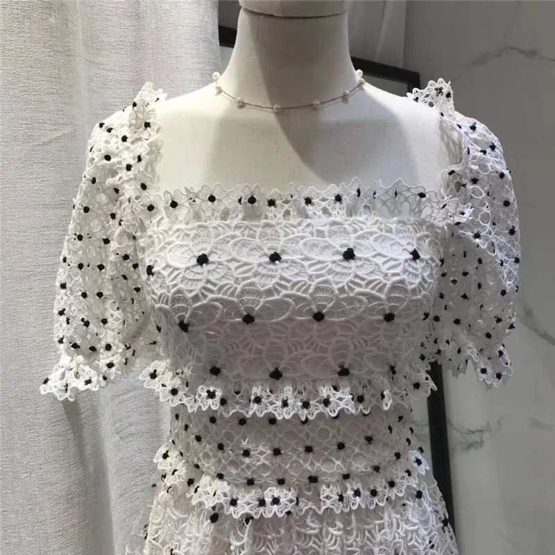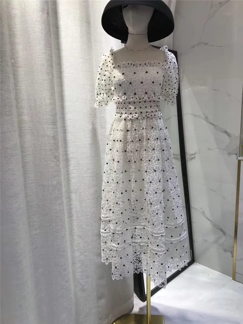 Женское вечернее платье, белое кружевное платье в горошек с короткими рукавами-фонариками и квадратным вырезом, лето 2019