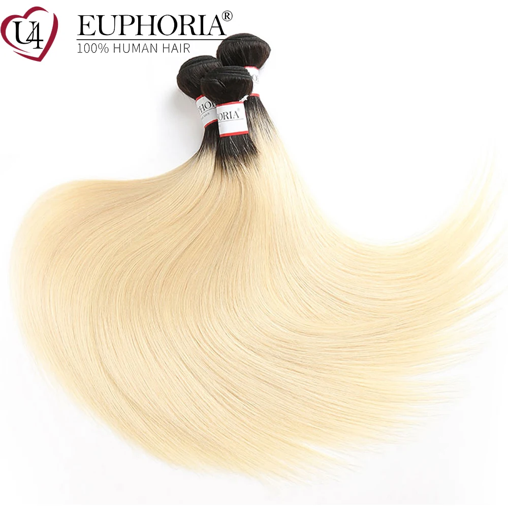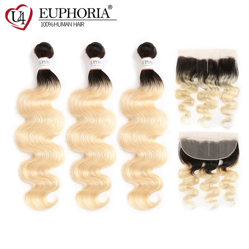 Эффектом деграде (переход от темного к блонд пучки волос с фронтальной мед 1B 613 Бразильский Реми человеческие волосы 3 Связки с закрытием Кружева Фронтальные EUPHORIA