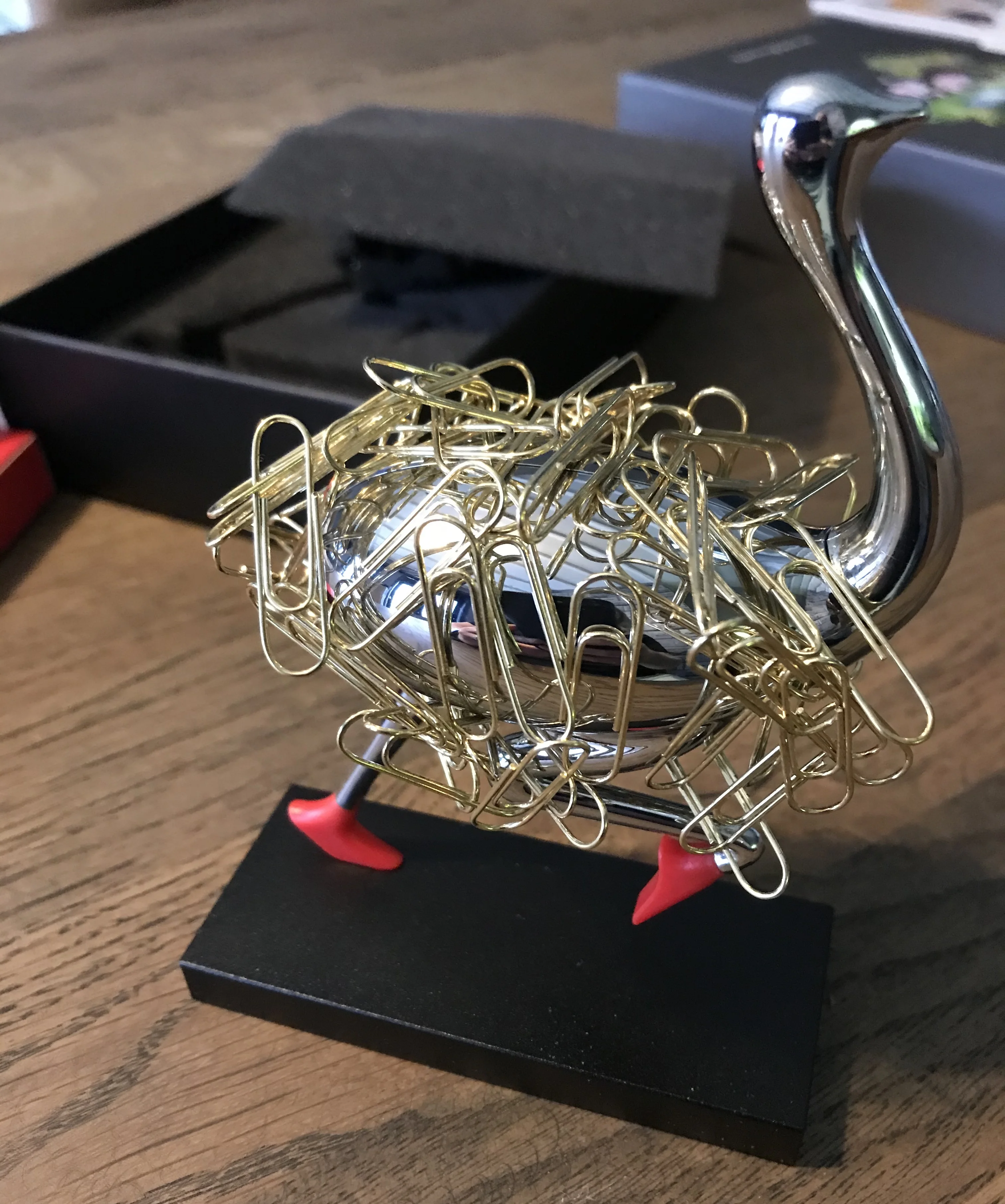 Товар оказался немного меньше (и по весу, и по размеру), чем мы ожидали, поэтому и выглядит хлипковато, но в целом я довольна. Больше аналога такого на Алиэкспресс за более низкую цену я не нашла,♀️ так что берите "раннинг острич" здесь)) /P.S.: скрепки держит норм +приходит в большой подарочной упаковке, так что как подарок в офис - самое то~✒️