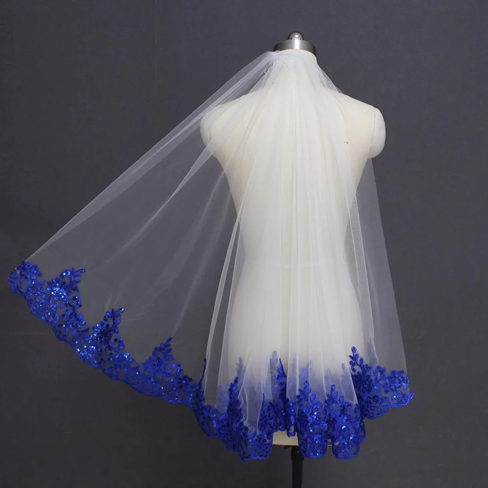 Фата невесты, однослойная короткая, блестящая, с гребнем, Королевский синий цвет с блестками, Кружевной Белыйслоновой кости