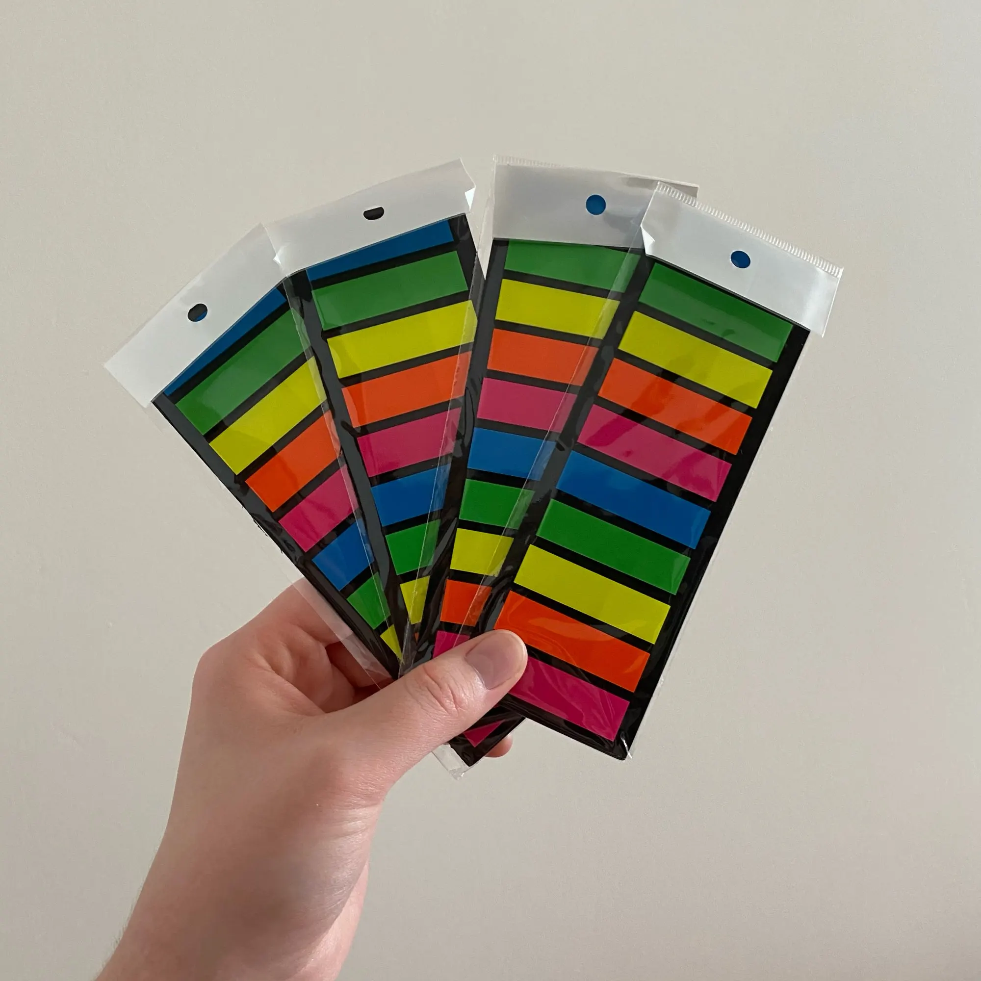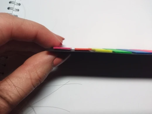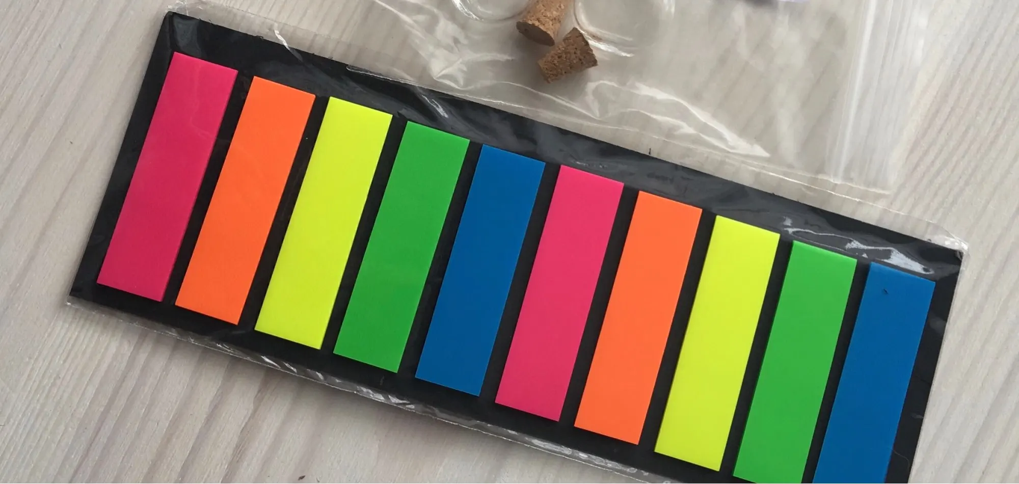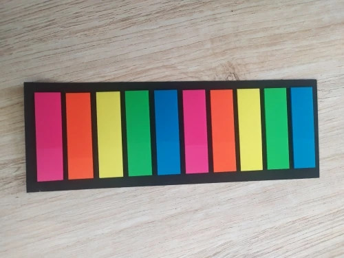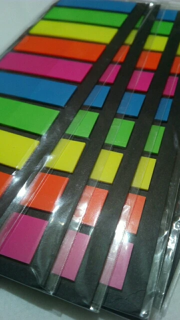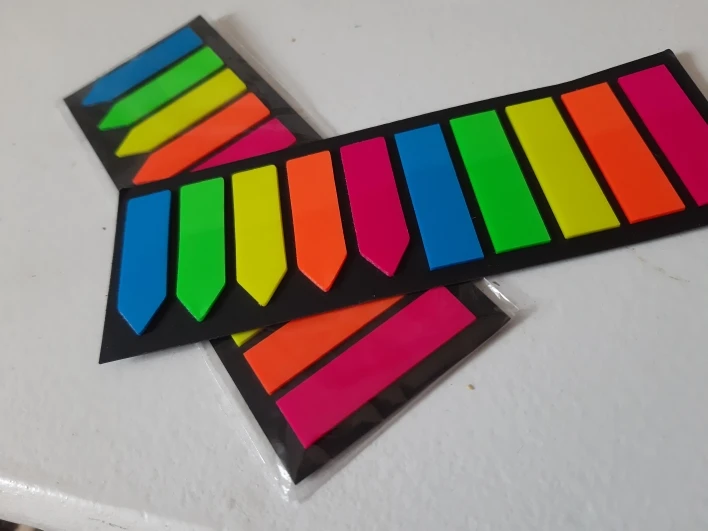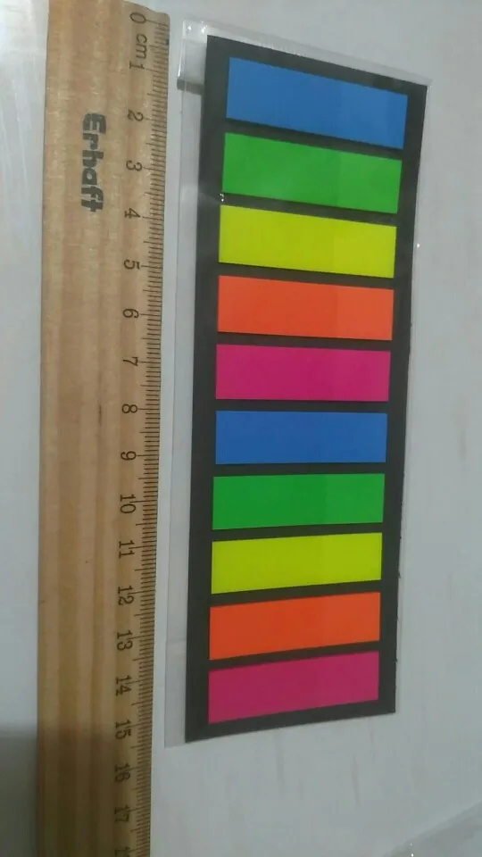 Яркие пластиковые закладки, довольно плотные, хоть и тонкие, размер 12 мм х 44 мм, липкий слой 13-14 мм.