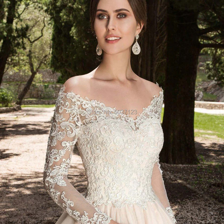 Трапециевидные Свадебные платья из тюля 2020 с v-образным вырезом и длинными рукавами, кружевные аппликации с открытыми плечами, Свадебные платья Vestido De Noiva