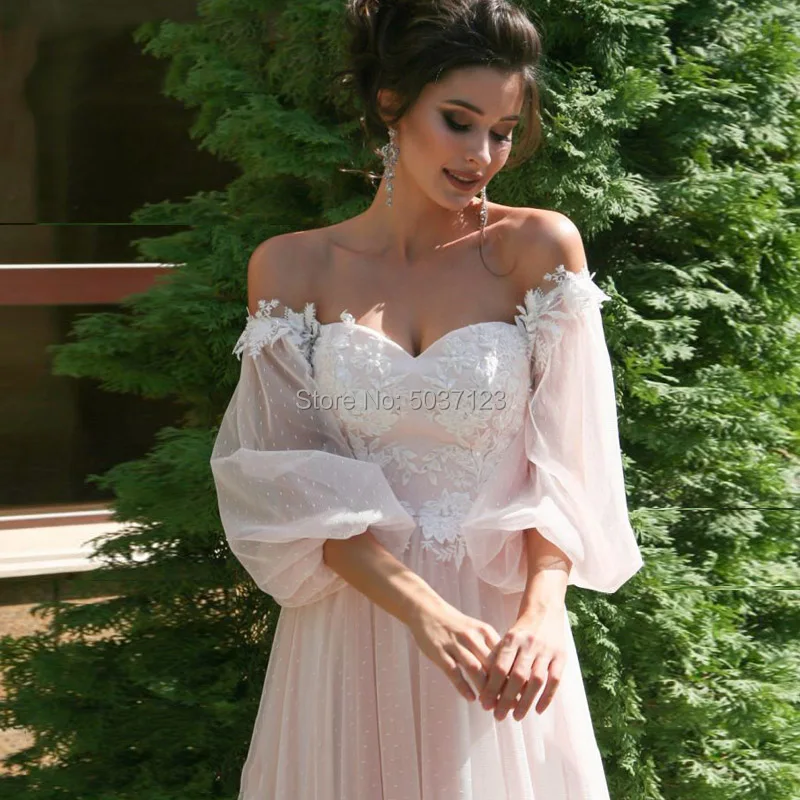 Женское свадебное платье с открытыми плечами, розовое пляжное ТРАПЕЦИЕВИДНОЕ ПЛАТЬЕ С кружевной аппликацией и пышными рукавами, свадебное платье, 2020