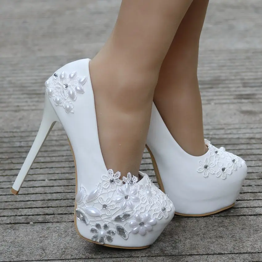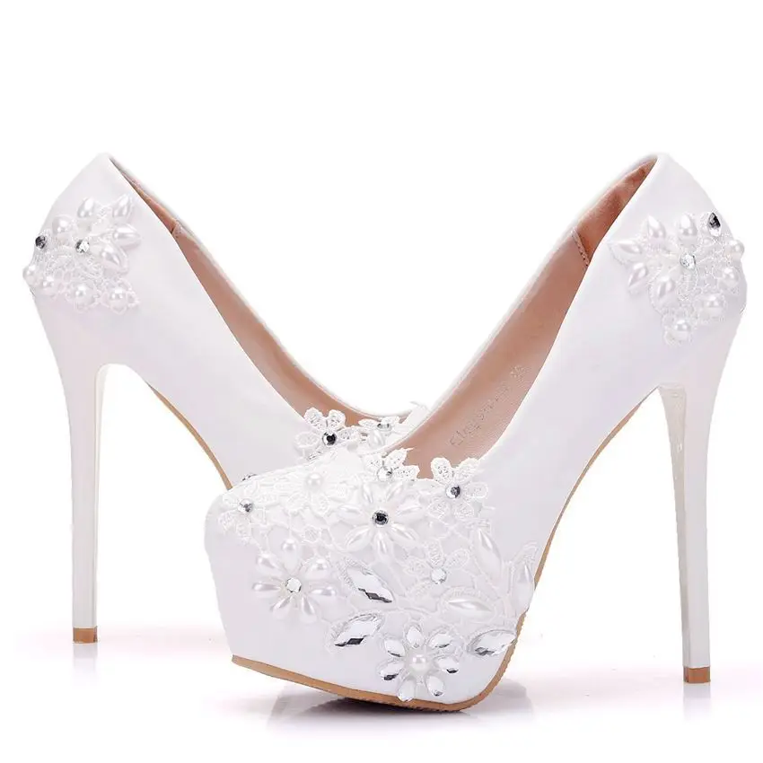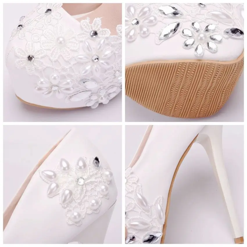 2021 Весенняя Новинка Белое Кружевное Платье Нежный высокого качества на высоком каблуке; Свадебные женские туфли; Стразы жемчуг большого размера кеды банкетные модельные туфли