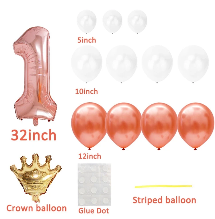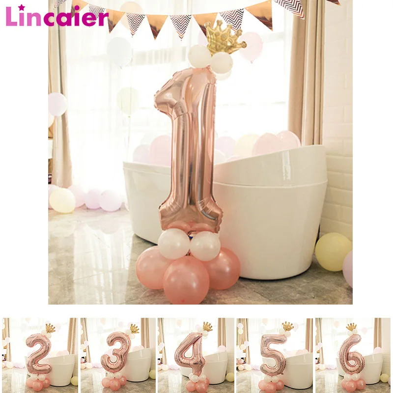 Фольга из розового золота с номером 1, 2, 3, 4, 5, 6, 7, 8 воздушными шарами, короной, короной на 1-й день рождения, для маленьких девочек, принцесс, украшения для вечеринки, для детей