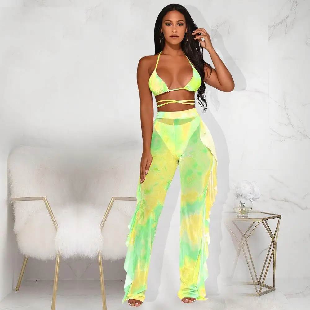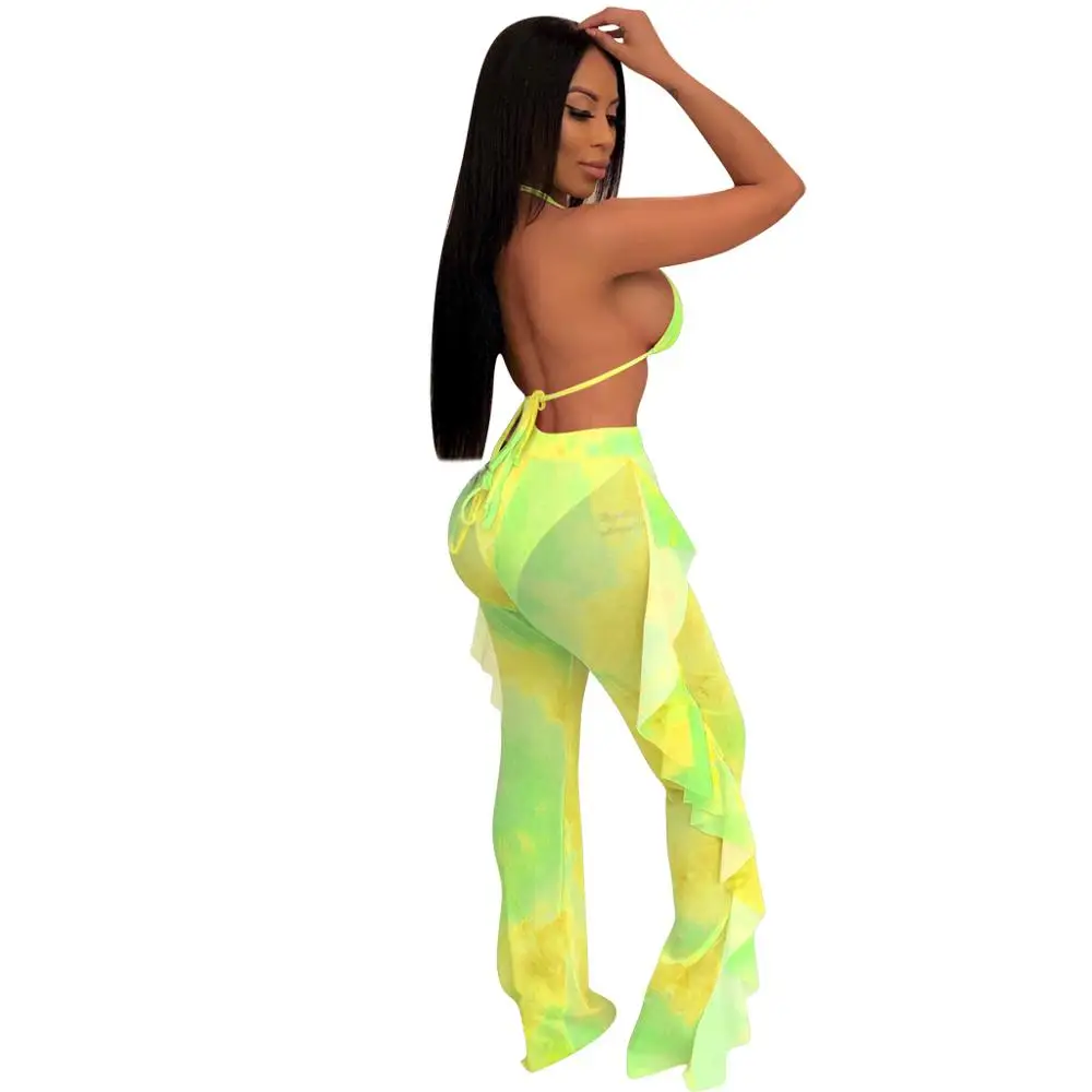 Пикантный Женский комплект Adogirl из двух предметов с принтом тай-дай, летние пляжные костюмы, бюстгальтер на бретелях, топ с оборками, широкие штаны, купальные костюмы, клубная одежда