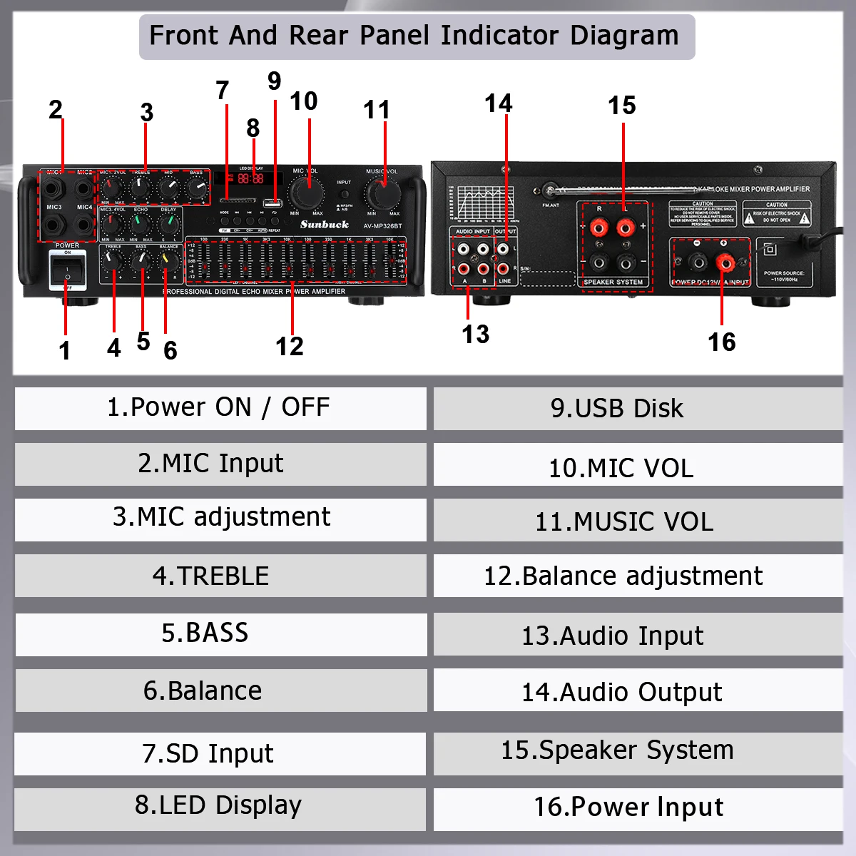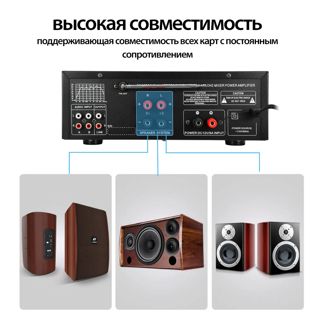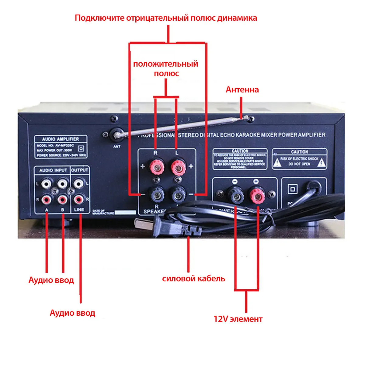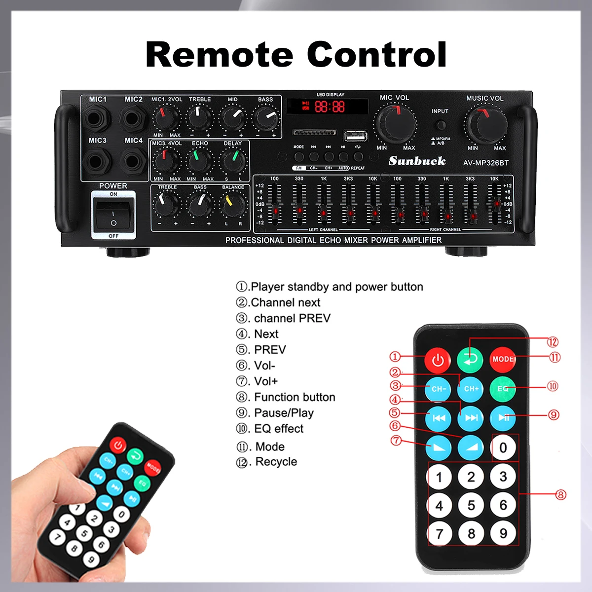 В комплект входит:1 х аудио усилитель мощности1 пульт дистанционного управленияХарактеристики:Размер: 26*29*10 смНоминальное напряжение: 220V-240V 50 / 60HzНоминальная мощность: 1200 ВтПики: 2000 ВтНоминальная частота: 20KH - 20 кГцОтношение сигнал-шум: 90 дБСтандартное сопротивление: от 4 до 16 ОмТип усилителя мощности: AV усилитель мощностиКанал: 2,0 каналОбщее гармоническое искажение: ≤ 0.5%Чувствительность входного сигнала: 200 мВ (± 30 мВ)Чувствительность на входе микрофона: 9 мВ (± 2 мВ)Выход уровня записи: 1 вВспомогательный уровень выхода: 1 вПоддержка: USB диск/макс. 64 Гб sd-карта (не входит в комплект)Цвет: черныйОсобенности:-Поддержка 4 способа вход для микрофона-Светодиодный дисплей-2 tack выход с эквалайзером-Реверберация, тонкая настройка, баланс, SD, USB интерфейс.Примечание: USB диск/макс. 64 Гб sd-карты не включены в посылка.