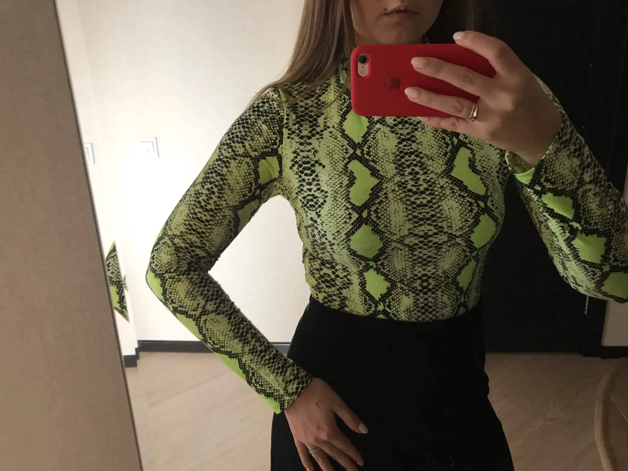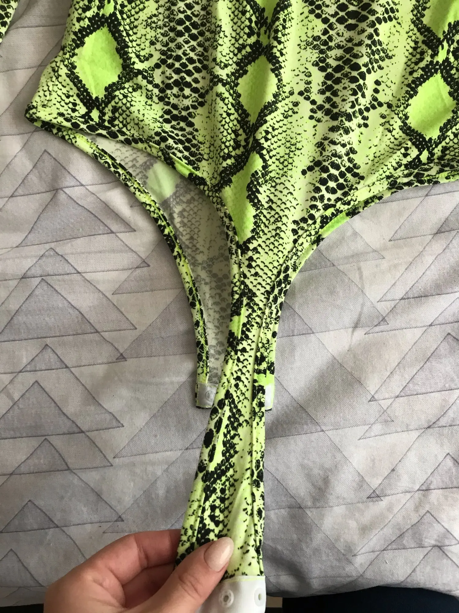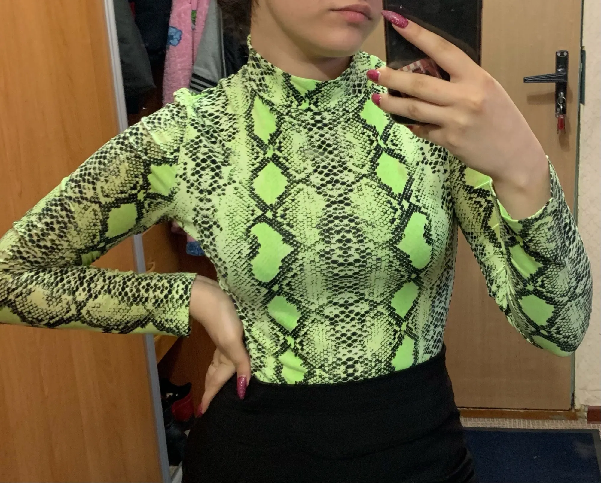 Она такая мягкая! Очень приятная ткань к телу. Цвет яркий. Мои параметры: ог - 98, от - 75, об - 104 села идеально. По длине в том числе. Правда, думала её носить на пол-дэнс, но у неё очень открытая паховая зона, хороша только под заправку в брюки или юбку. Застежка на кнопках внизу, кнопки на месте, рабочие.