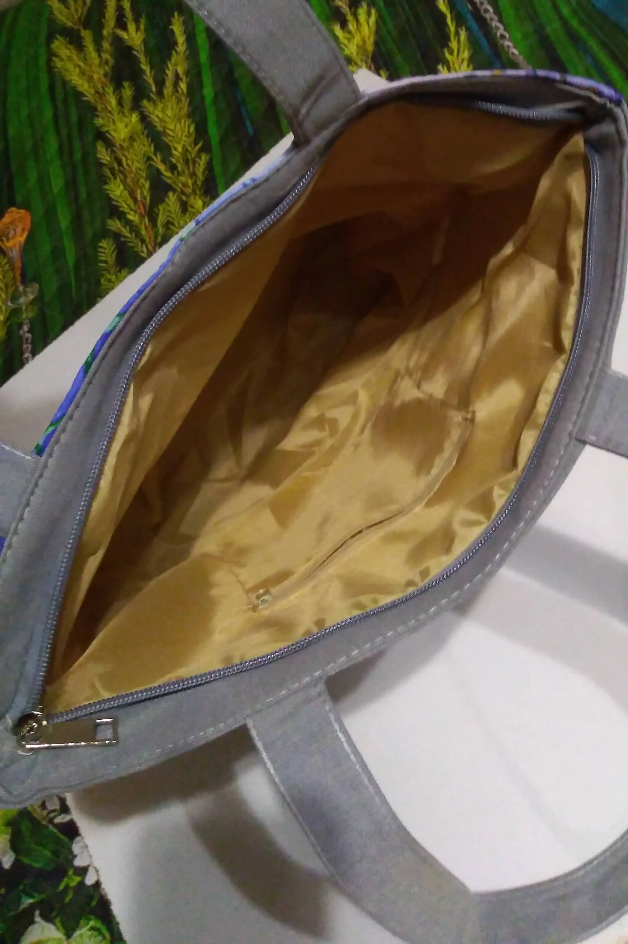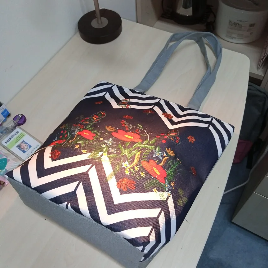 Красивая вместительная сумка с ярким рисунком. Внутри подкладка с карманом на молнии. Ручки достаточно длинные, чтобы носить на плече. Тыльная сторона сумки однотонная серая, как и ручки, поэтому выбирала рисунок, сочетающийся с серым. Всем довольна, рекомендую товар и продавца.