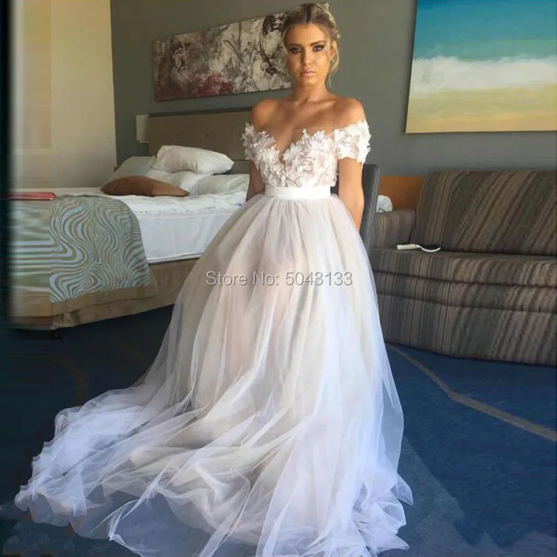 Сексуальные свадебные платья с открытыми плечами в стиле бохо 2021, ТРАПЕЦИЕВИДНОЕ кружевное Тюлевое пляжное свадебное платье с короткими рукавами, платья