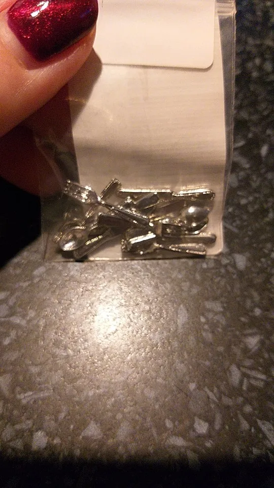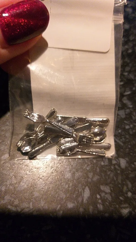 H/I: Цвет: золотистый, серебристыйРазмер: ложка и вилка длиной 2 см и длиной 2,2 см