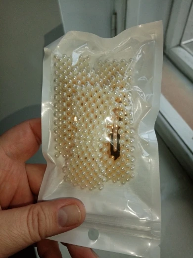 Чуть сероватые бусины. Размер очень большой, волосы держат хорошо. У одной закалки центральная крупная бусина сильно поцарапана, перевернула другой стороной- все ок стало. Хотелось бы качество бусин получше. В целом - все ок.