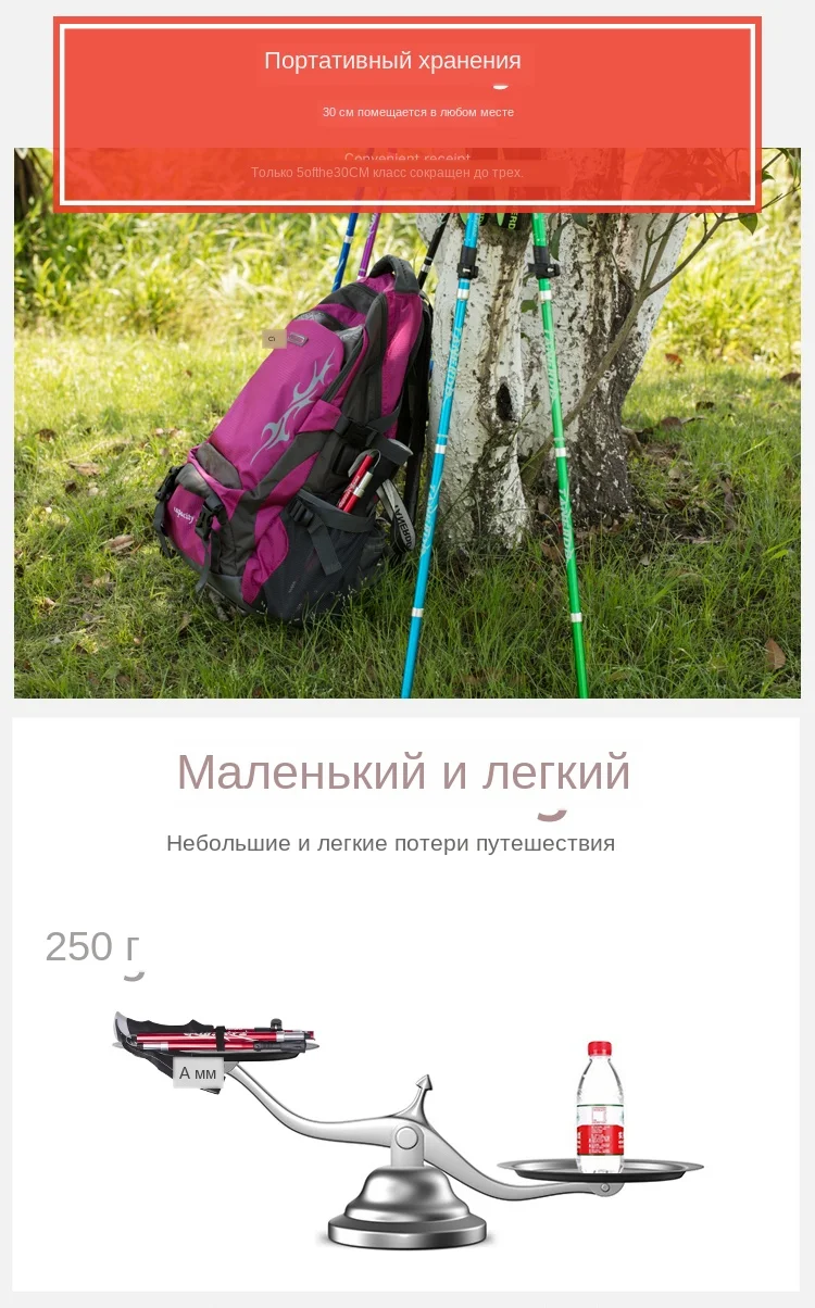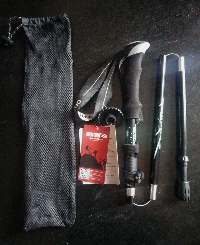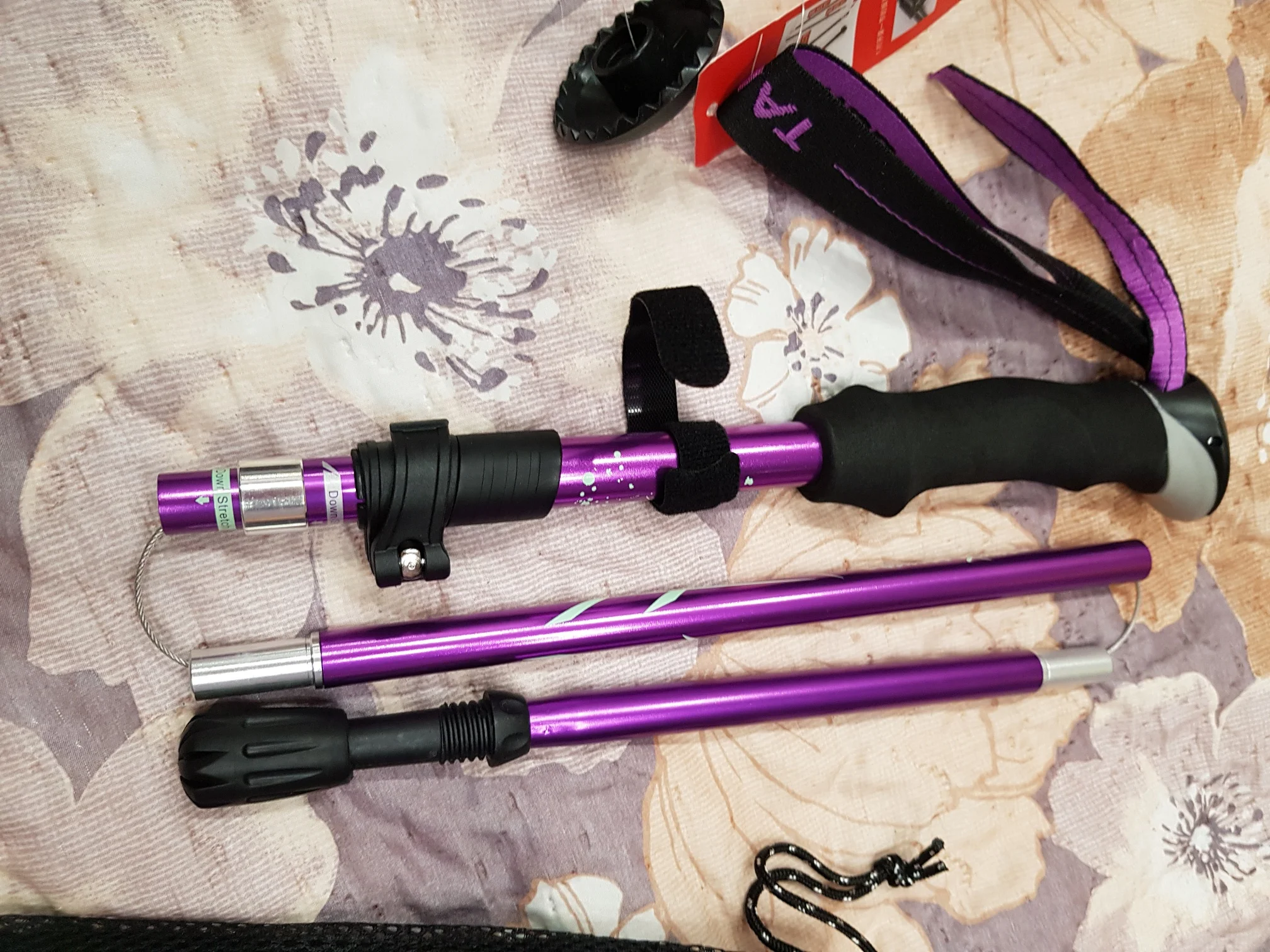 Палки отличного качества. Легкие, достаточно прочные для людей небольшого роста, удобно раскладывать. Ручки и темляк удобные. Хорошо, что есть фиксатор – внешняя система блокировки. Еще удобно, что есть липучка, фиксирующая делали палки вместе. В комплекте поставляется одна палка в чехле с дополнительной насадкой для снега (песка). Я заказывала 2 палки, продавец вложил еще один дополнительный комплект из трех насадок на одну палку. Можно вложить в боковые кармашки рюкзака, также подвесить на специальные крепления (ремешки) как на моем фото. Осталось только попробовать в горах. Доставка очень быстрая, посылка пришла за 1 неделю в МО, упаковано отлично. Очень довольна товаром и продавцом. Рекомендую.