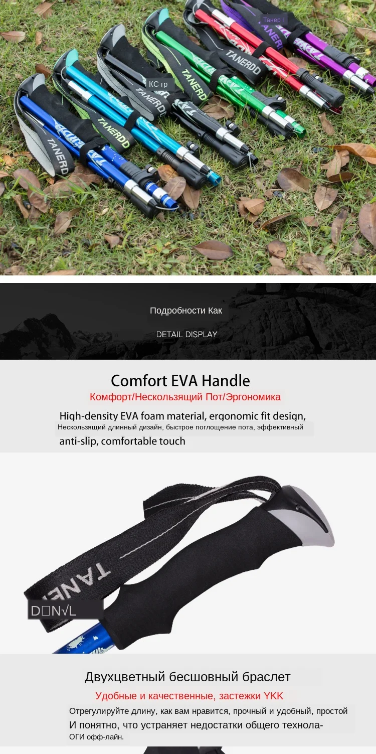 Отличные палки, телескопические, на тросике. Собираешь, потом вверх тянешь часть с темляком и конструкция фиксируется (тросик натягивается) - выскакивает шпинёк. Рукоять удобная, в т.ч. под руку в толстых перчатках или большую руку. Цвет - приятный голубой с зелёными надписями. Мне очень понравились, отличные палки. Как на фото. Да, каждая палка упакована в отдельную сетку.