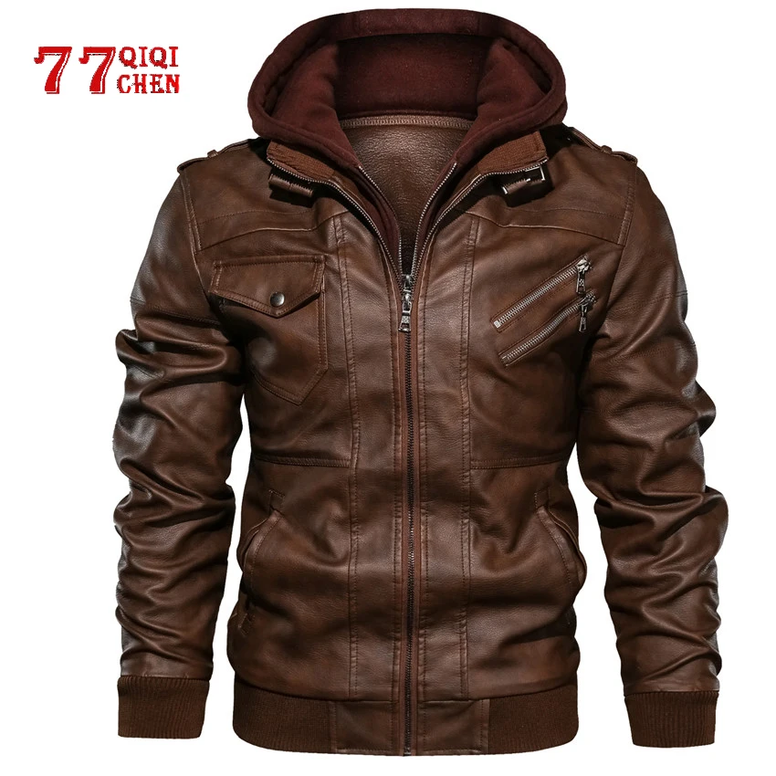 QIQICHEN мужская кожаная куртка повседневная мотоциклетная куртка со съемным капюшоном из искусственной кожи мужские куртки на Косой молнии Европейский размер jaqueta couro