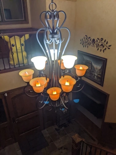 Быстрая доставка, упаковка немного помята, но всё работает. Вполне реалистичное мерцание, по восприятию интенсивность света невысокая, уютная обстановка получается. Продавцу спасибо!