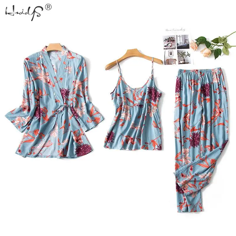 Корейский Элегантный хлопковый пижамный комплект с цветочным рисунком, Женский костюм-тройка, повседневная одежда для сна, блуза и штаны, женские пижамные комплекты