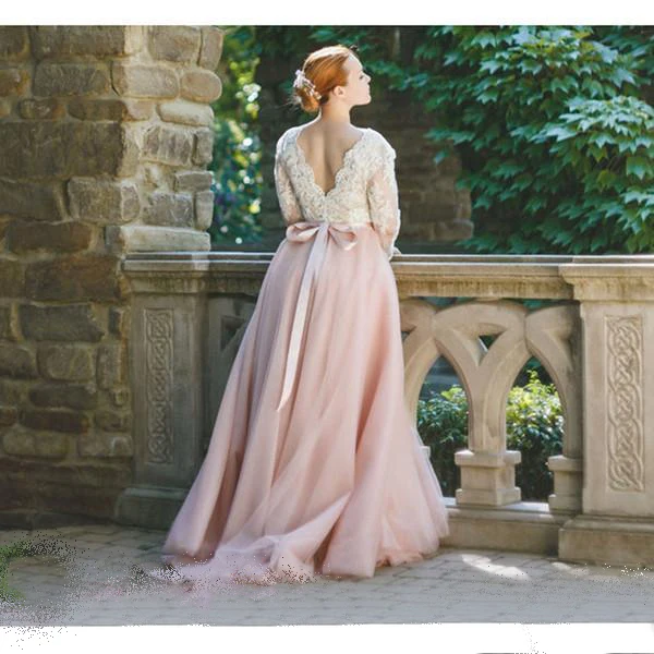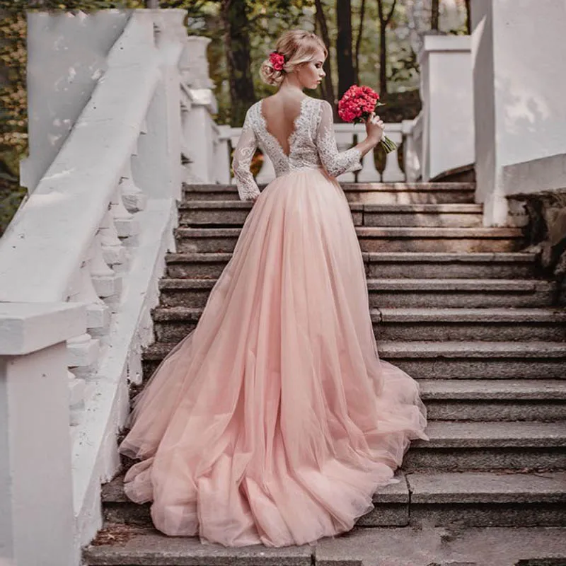 Розовые Свадебные платья с длинными рукавами, с v-образным вырезом, с кружевной аппликацией, со шлейфом, трапециевидной формы, с открытой спиной, свадебные платья, Vestidos de Noivas