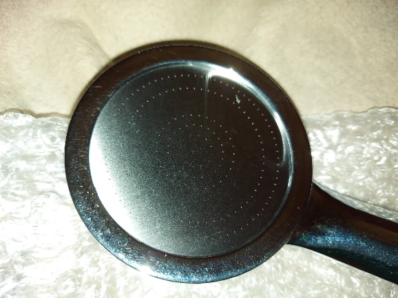 Небольшая по габаритам насадка для душа, удобная ручка, сама круглая от куда будет литься вода расположена почти под 90 градусов что удобно при эксплуатации, отверстий много и они сами очень тонкие по этому брызг почти не остается, принимать душ одно удовольствие.