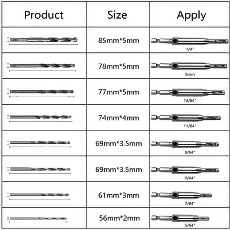 Размер сверла:5/64 ", 7/64", 9/64 ", 11/64", 5 мм, 13/64 ", 1/4"