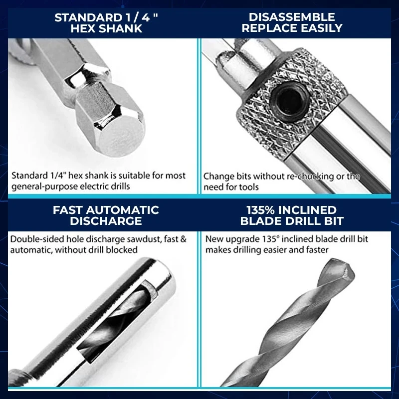 Надежный и прочный:Искусно изготовленные из авиационного алюминия и углеродистой стали, эти сверла чрезвычайно прочные, противоударные и устойчивые. Они будут работать долго после завершения работы.