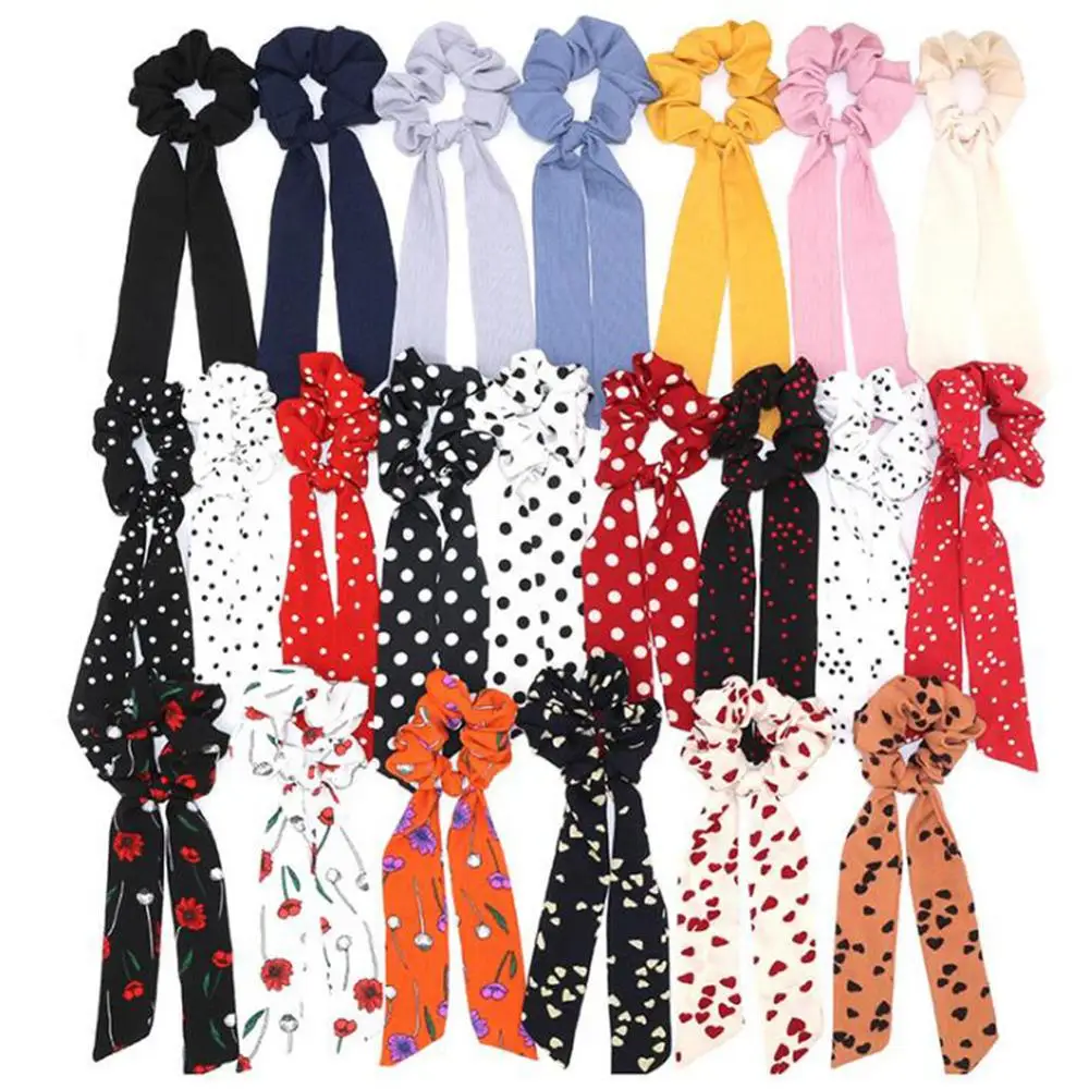 Элегантные женские резинки с цветочным принтом и конским хвостом, Длинные эластичные резинки для волос с лентами, аксессуары для волос с узлом в горошек для девочек