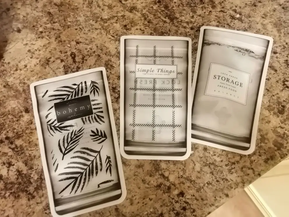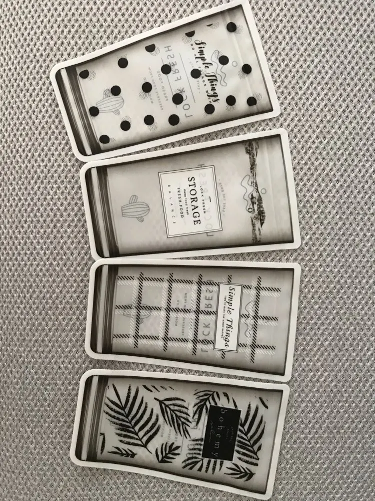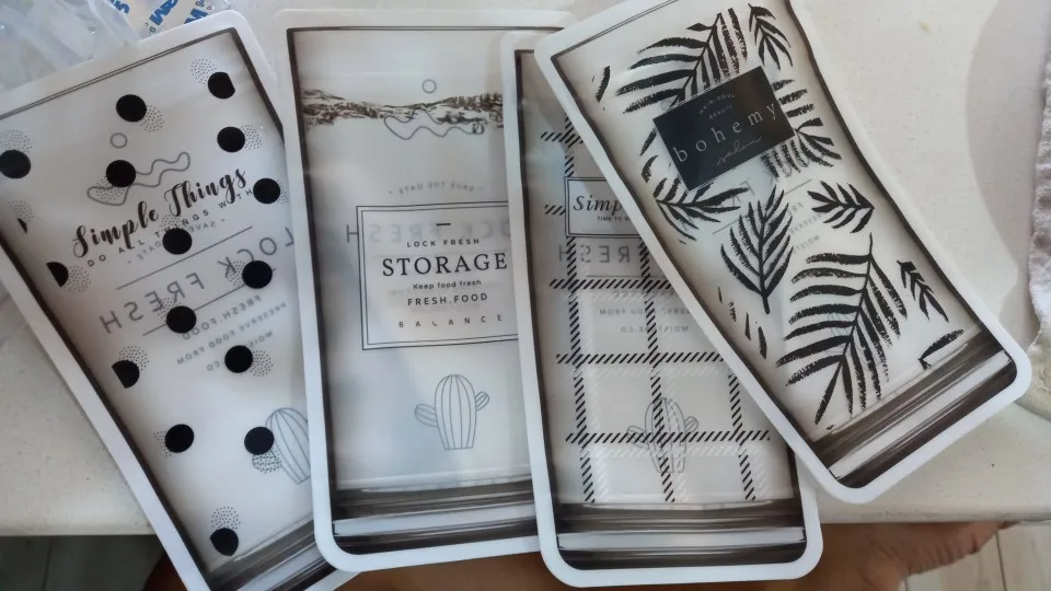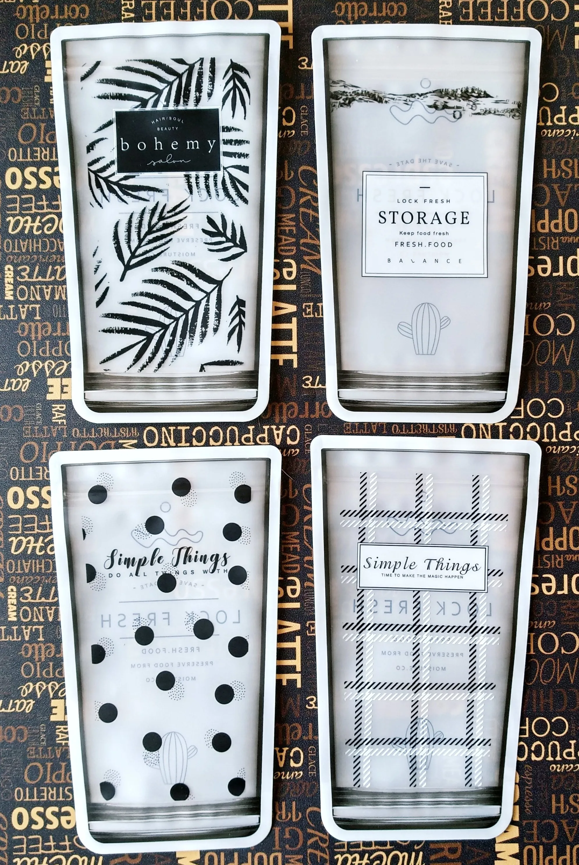 Действительно милые многоразовые пластиковые пакеты с замком для закусок, фруктов, всего хорошего. Я брошу один в свою сумку, в которую я поместил миндаль, а другой с морковкой. Набор из 4 сумок поставляется с 4 принтами. Я использовал довольно немного, и он все еще держится!
