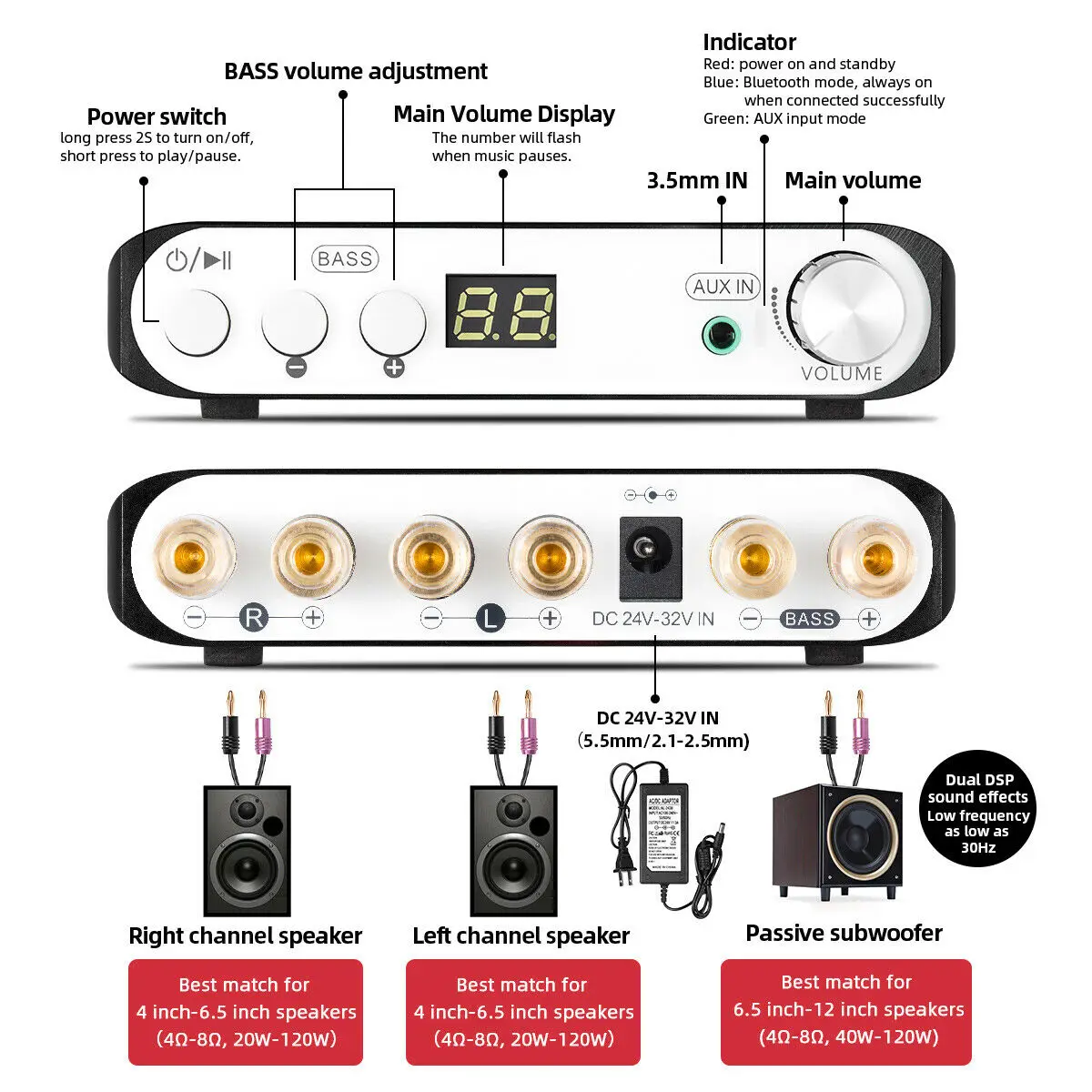 2. По умолчанию высылается вариант с 24V/3A(72 Вт) источника питания достаточно для 1 пара 5 дюймов динамик и 1*6,5 дюймовый сабвуфер. Но напольным динамикам более 1 м требуется больший источник питания. Автоматическое отключение во время использования означает, что колонки нуждаются в более высокой мощности, пожалуйста, выключите громкость или измените больший источник питания.
