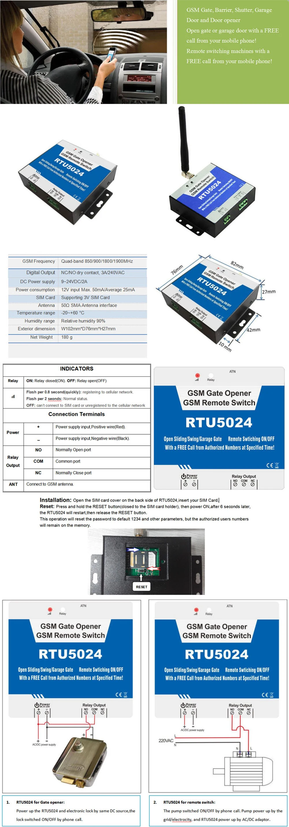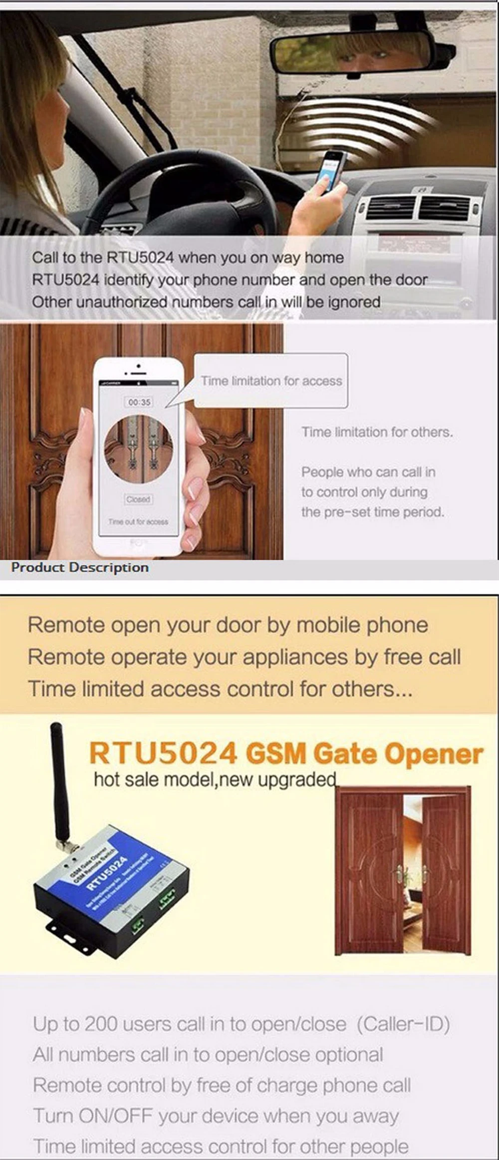 * 850/900/1800/1900MHz quad диапазоны, могут работать в глобальных GSM сетях.* Никаких звонков. Реле GSM отвечает на вызов с авторизованного номера, затем выполняет действие включения/выключения на первом 'кольце'.* Безопасное использование идентификатора звонящего для идентификации, неизвестные звонящие игнорируются.* Добавьте или удалите пользователей с помощью sms-команды.* Нет необходимости предоставлять пульт дистанционного управления или ключи для разных пользователей.* До 200 авторизованных телефонных номеров можно настроить в указанное время.* Действие реле вернет подтверждение SMS владельцу или авторизованному номеру вызова, эта функция редактируется пользователем.* Реле закрывается или время открытия программируется.* Несколько приложений. (Ворота, болты, барьеры, гаражные ворота, жалюзи и двери доступа или машины).