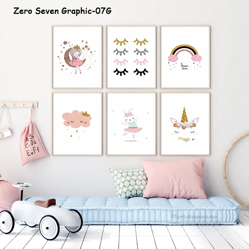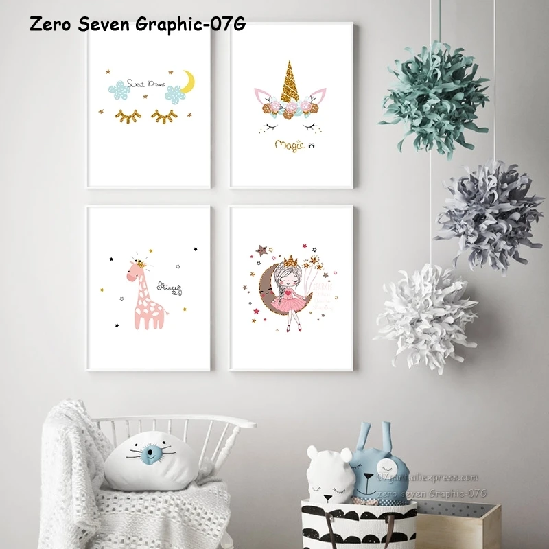 Симпатичные Блестящий мультфильм, единорог, корона, девушка, жираф, холст, живопись, Постер и печать картин, детская комната, для спальни, домашний декор
