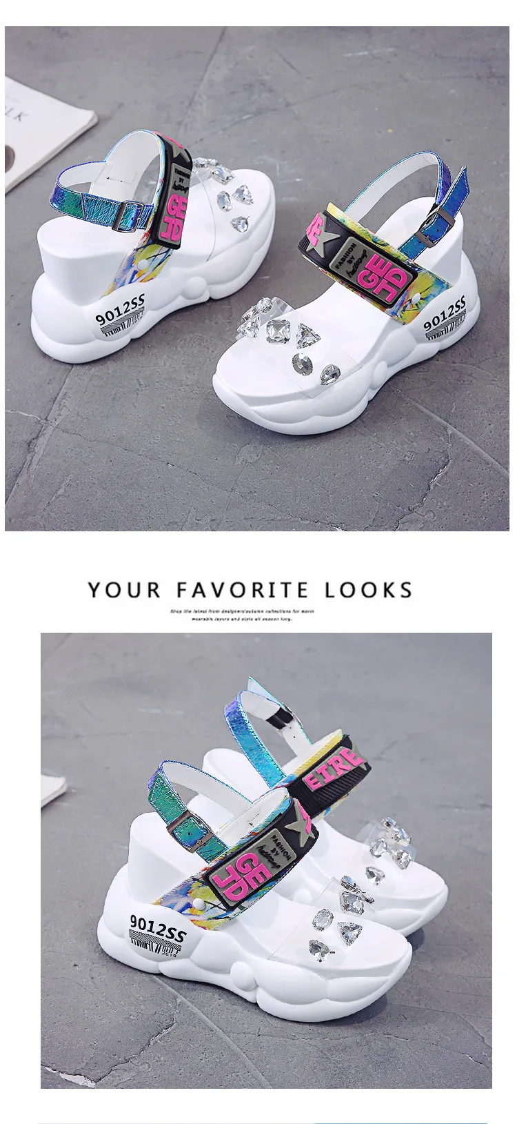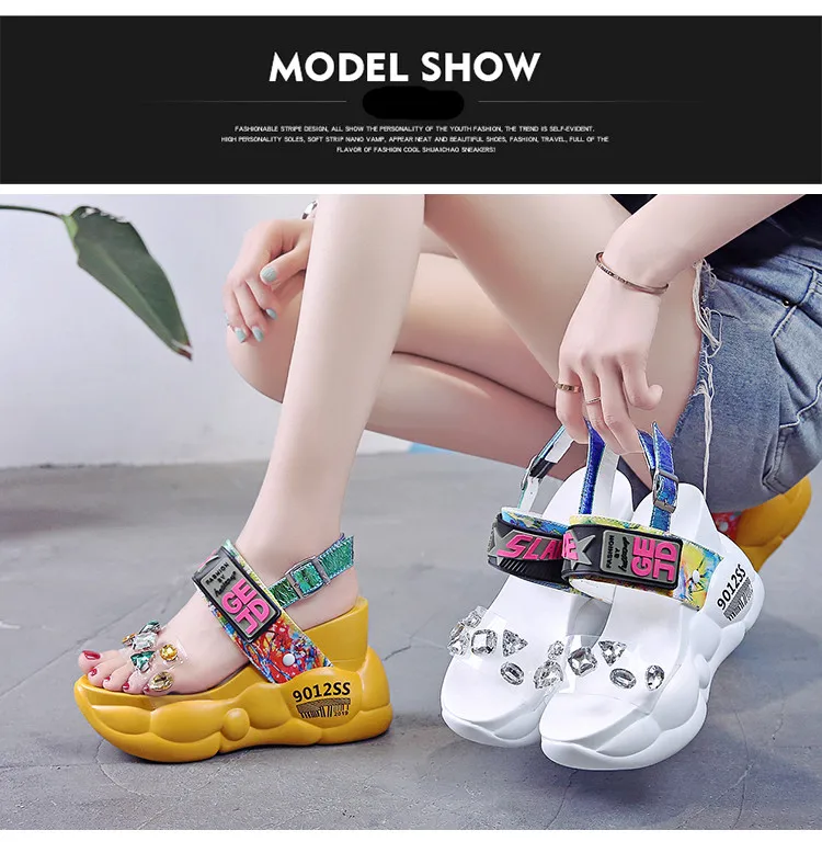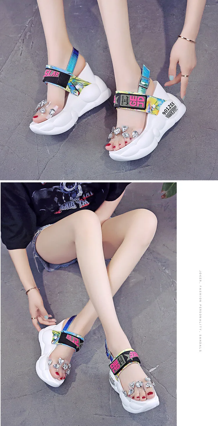 Сандалии женские на платформе, босоножки на танкетке 11 см и толстой подошве, стразы, пляжные кроссовки, со стразами, лето 2020