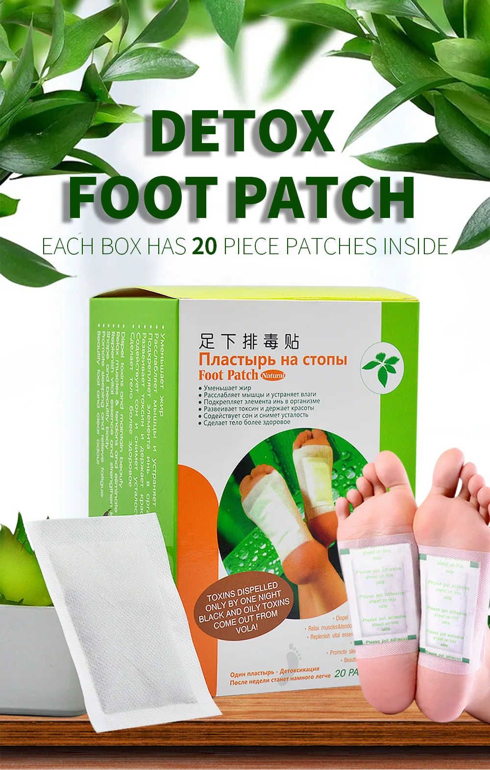 УпаковкаВ комплект входит:2 упаковки = 40 пластырей Детокс патч для ног