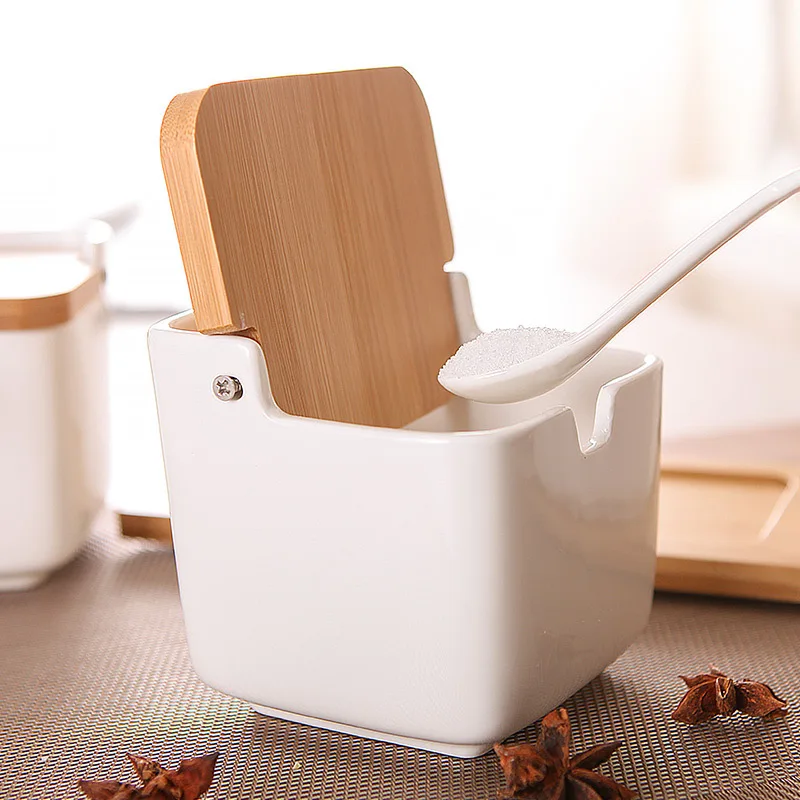 Кухонный керамический контейнер для соли, банки для перца с крышкой, ложка фарфоровая шкатулка, Бамбуковая крышка, полка для приправ