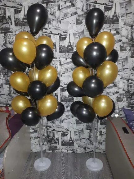Заказ пришёл во время, соответствует описанию. Все детали целые. С шариками смотрится очень красиво и кстати это очень экономично, не надо тратить кучу денег на оформление, когда можно сделать всё самим. на фото 2 изображена собранная стойка с надутыми воздухом шарики. Получилось очень красиво.